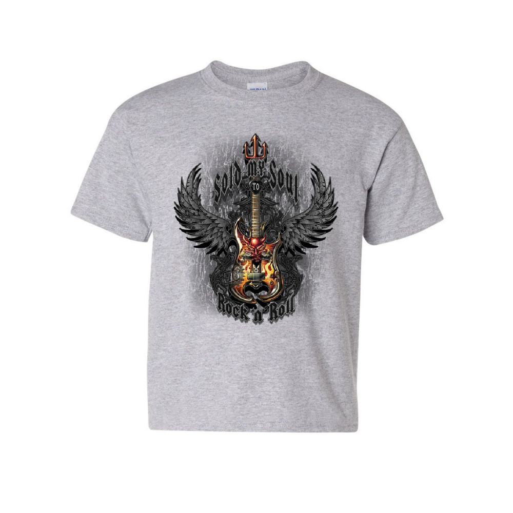SOLD MY SOUL TO ROCK & ROLL youth t-shirt demon guitar wings trident kids tee gray