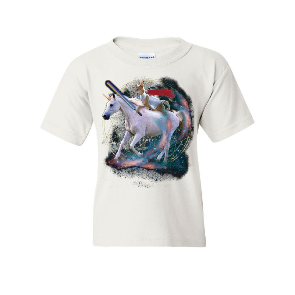 SPACE CAT RIDING A UNICORN with a saber youth t-shirt weird universe kids tee white