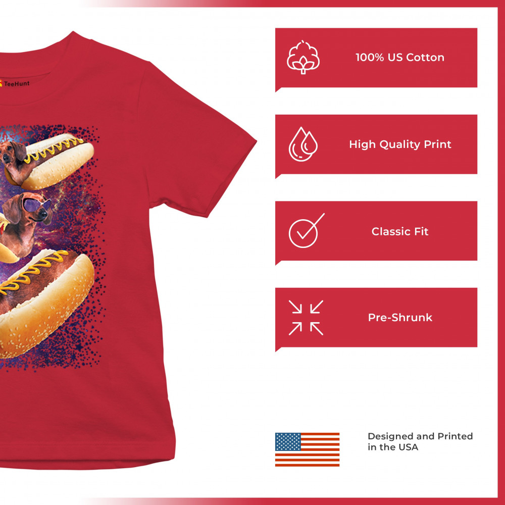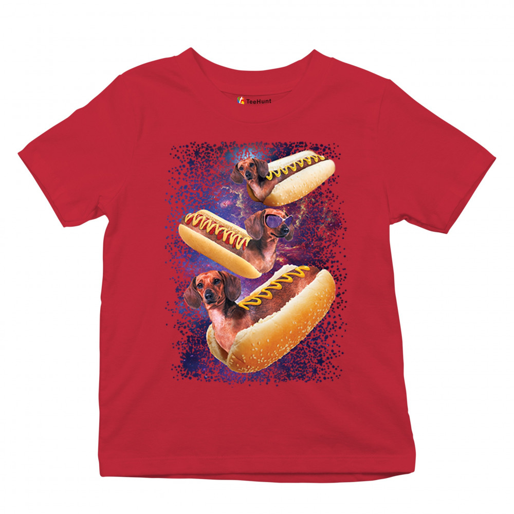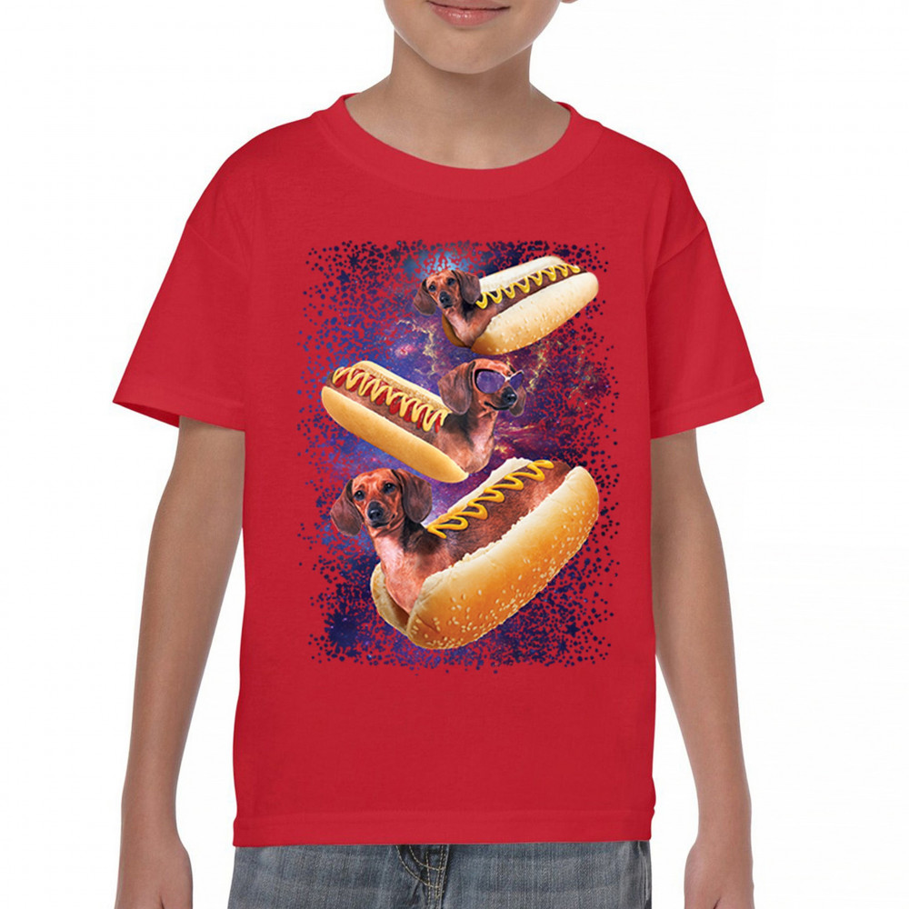 Quirky and fun tee featuring dachshunds as hotdogs in a cosmic setting. Perfect for dog and space lovers. Comfortable and durable.