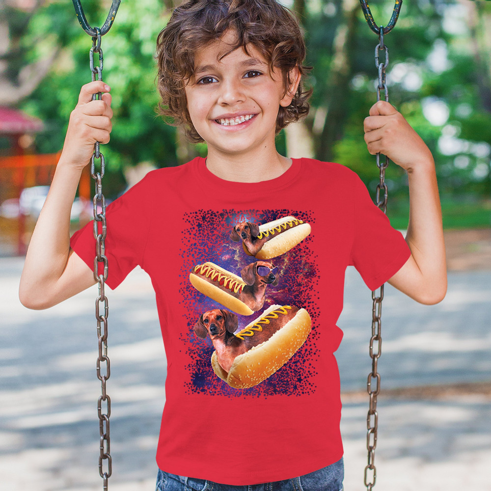 Add a dash of humor to your wardrobe with our unique design featuring adorable dachshunds as hotdogs in a cosmic setting. This playful graphic is perfect for animal lovers and those with a quirky sense of style. The vibrant colors and detailed illustration ensure you stand out in any crowd. Made from premium materials, this tee offers both comfort and durability, making it ideal for everyday wear or special occasions. Embrace your love for dogs and space with this fun and imaginative design.