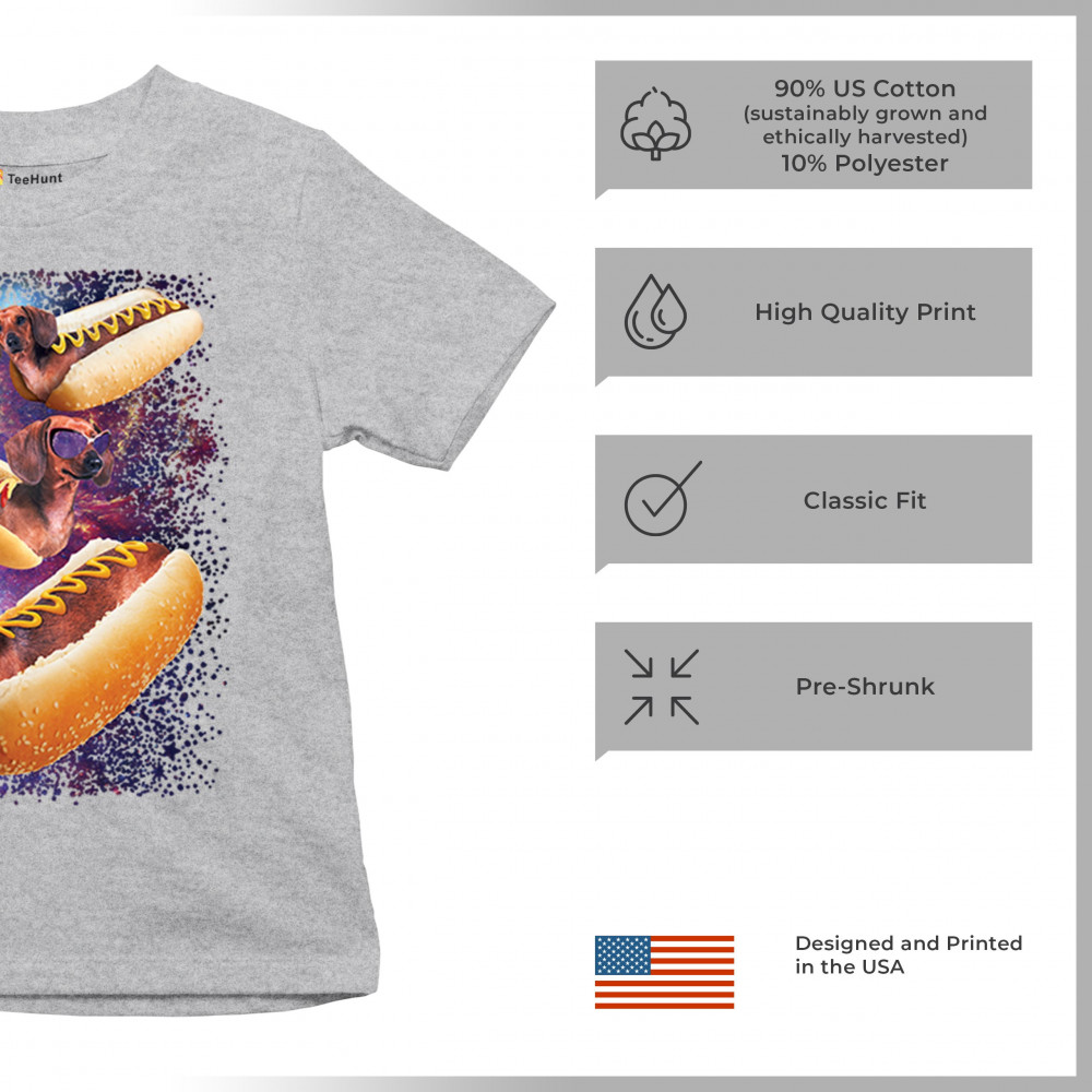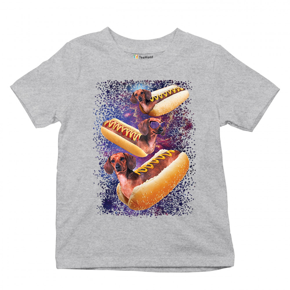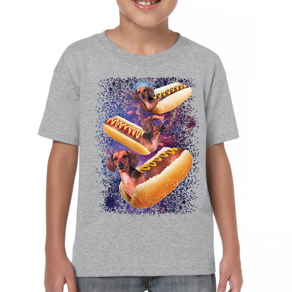 Quirky and fun tee featuring dachshunds as hotdogs in a cosmic setting. Perfect for dog and space lovers. Comfortable and durable.