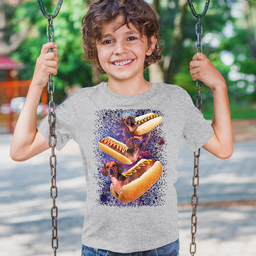 Add a dash of humor to your wardrobe with our unique design featuring adorable dachshunds as hotdogs in a cosmic setting. This playful graphic is perfect for animal lovers and those with a quirky sense of style. The vibrant colors and detailed illustration ensure you stand out in any crowd. Made from premium materials, this tee offers both comfort and durability, making it ideal for everyday wear or special occasions. Embrace your love for dogs and space with this fun and imaginative design.