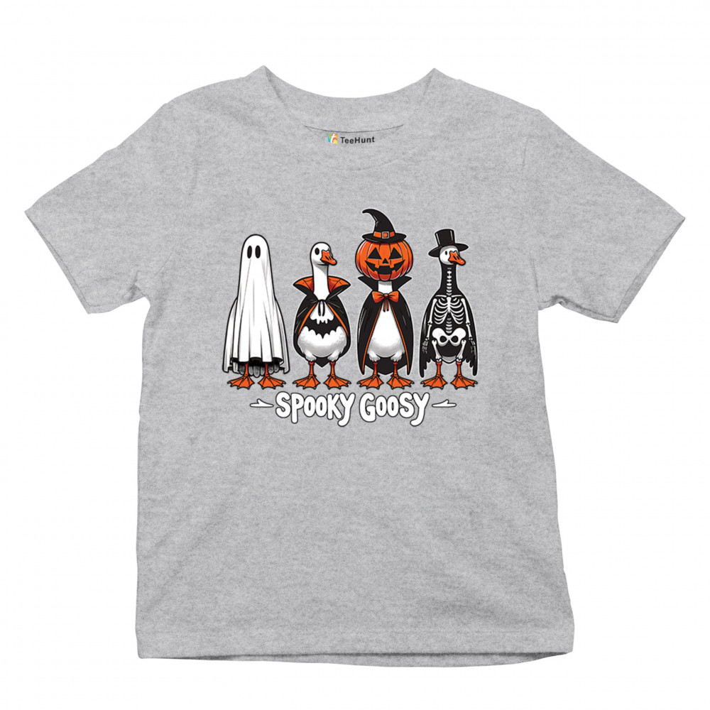 Spooky Goosy Halloween design with geese in witch, skeleton, vampire, and pumpkin costumes. Perfect for October 31, haunted house, and scary night fun.