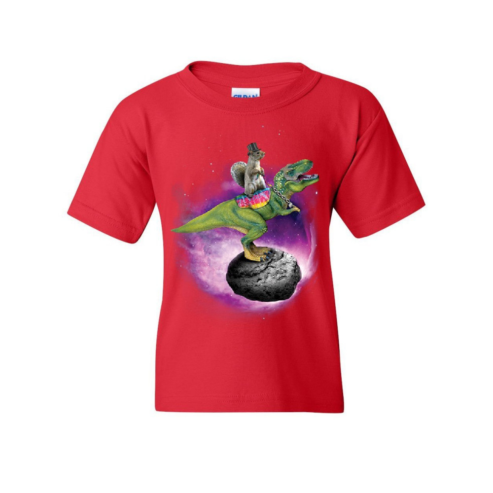 SQUIRREL RIDING T-REX RIDING ASTEROID youth t-shirt funny space weird kids tee red
