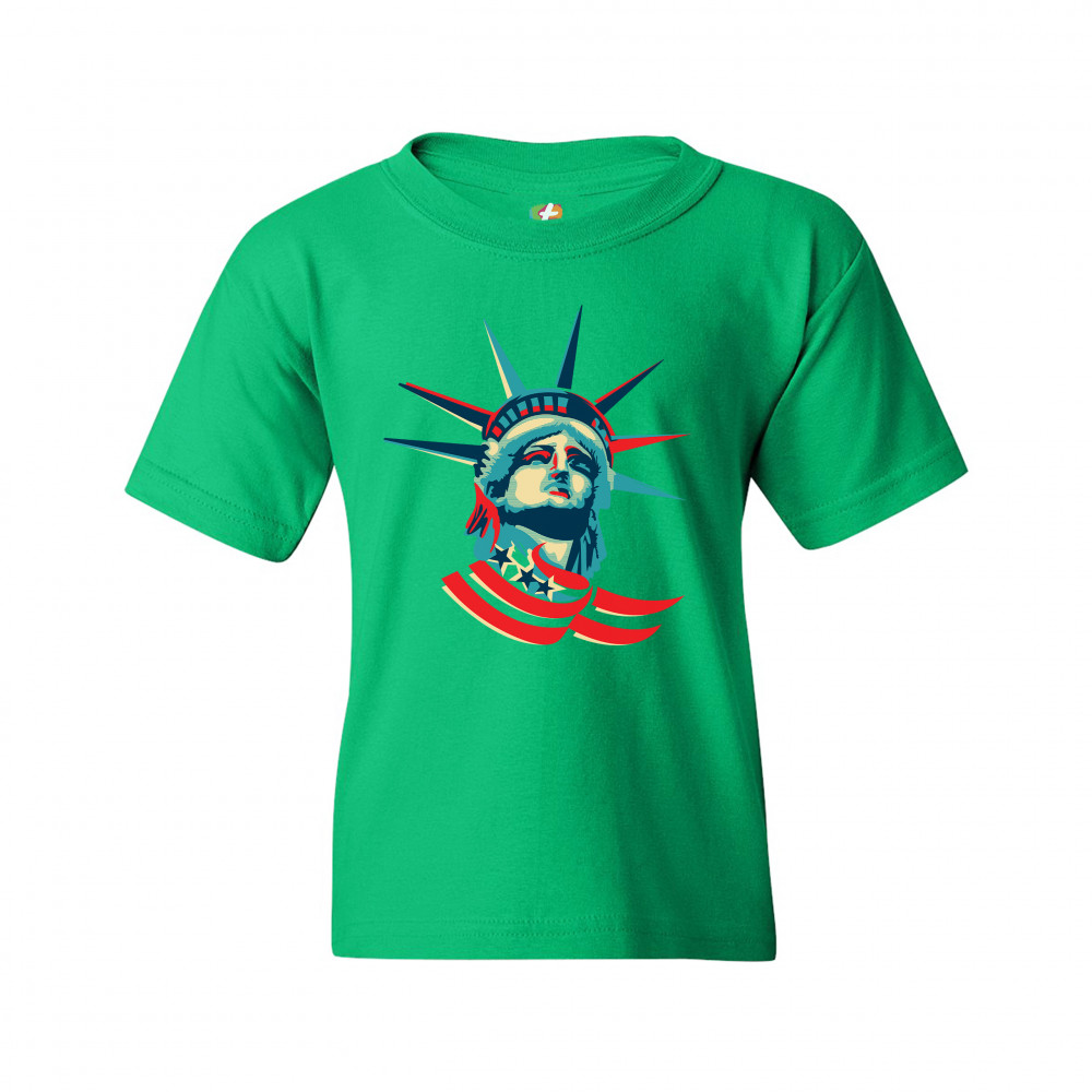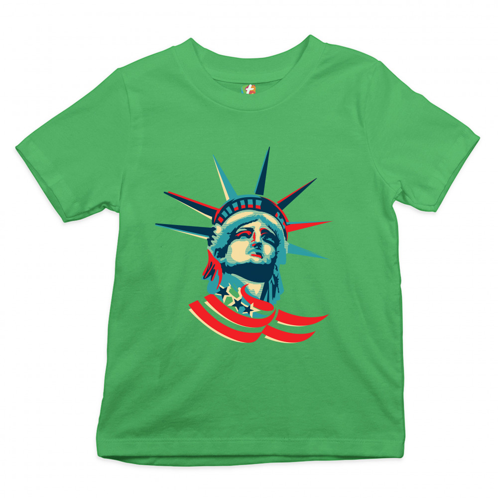 A patriotic print featuring a dripping silhouette of a bald eagle. The body is painted blue with lots of stars on it and the feathers of the wings, painted red, resemble the stripes of the American Flag. Over the wings there is a text written: "Land of the free home of the brave". Great choice to wear on Independence Day or any other patriotic holiday.