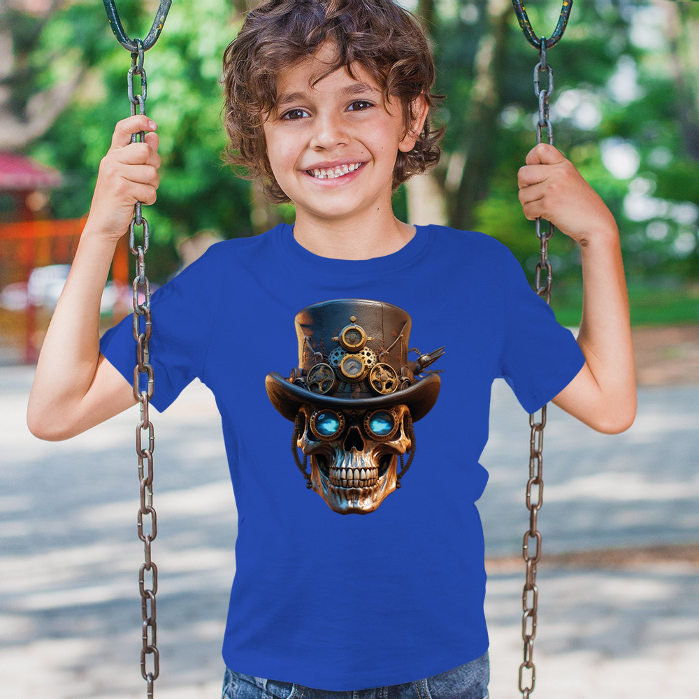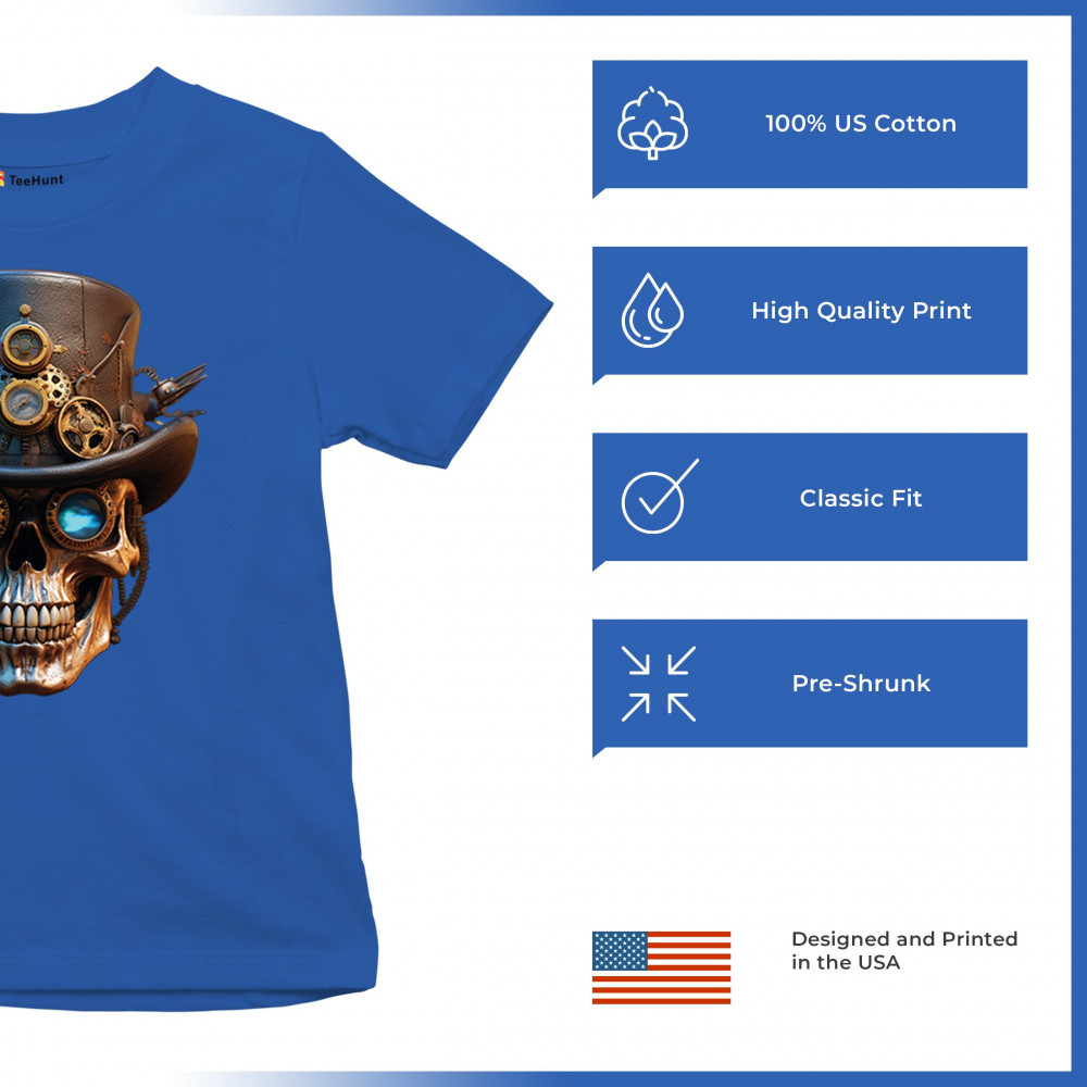 Steampunk skull shirt with gothic retro-futurism. Perfect for Halloween, cosplay, biker rallies, and edgy rebel fashion lovers.