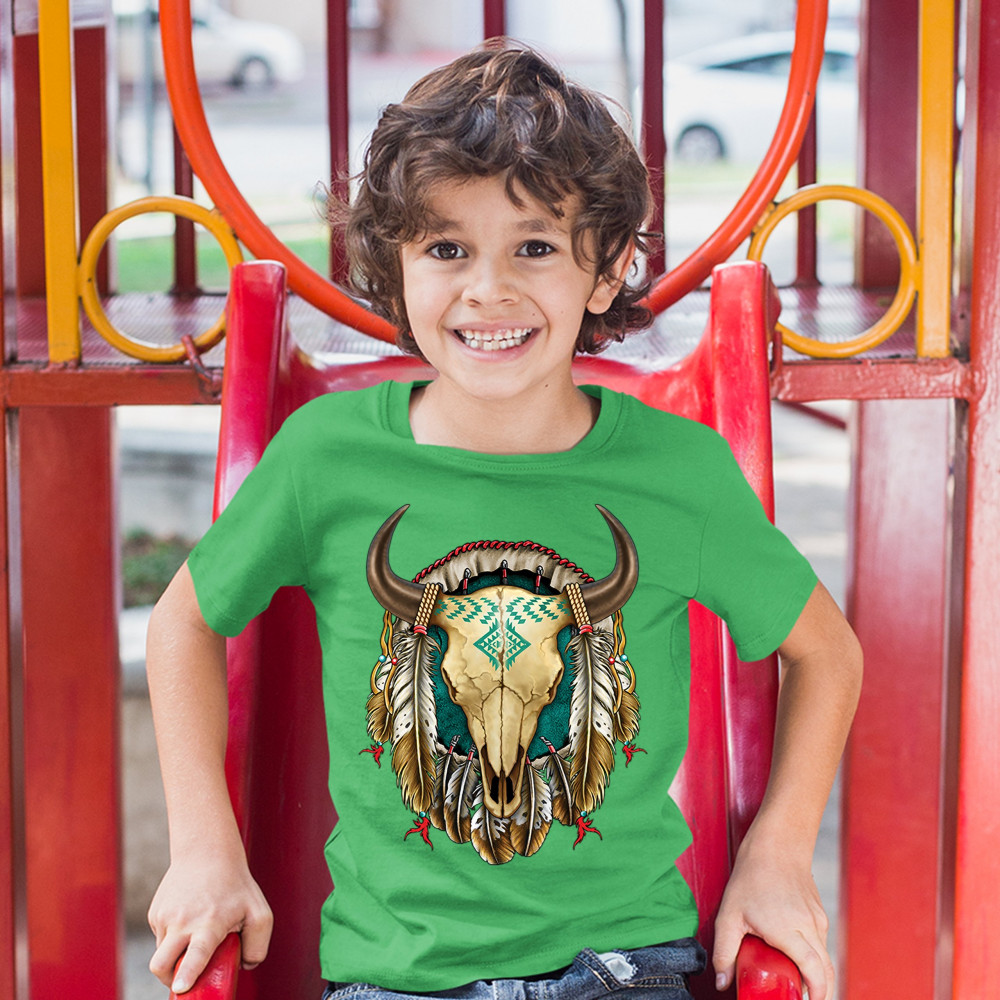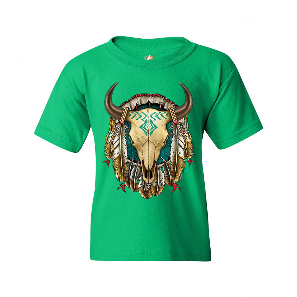 STEER SKULL DREAMCATCHER youth t-shirt native american indigenous culture kids green