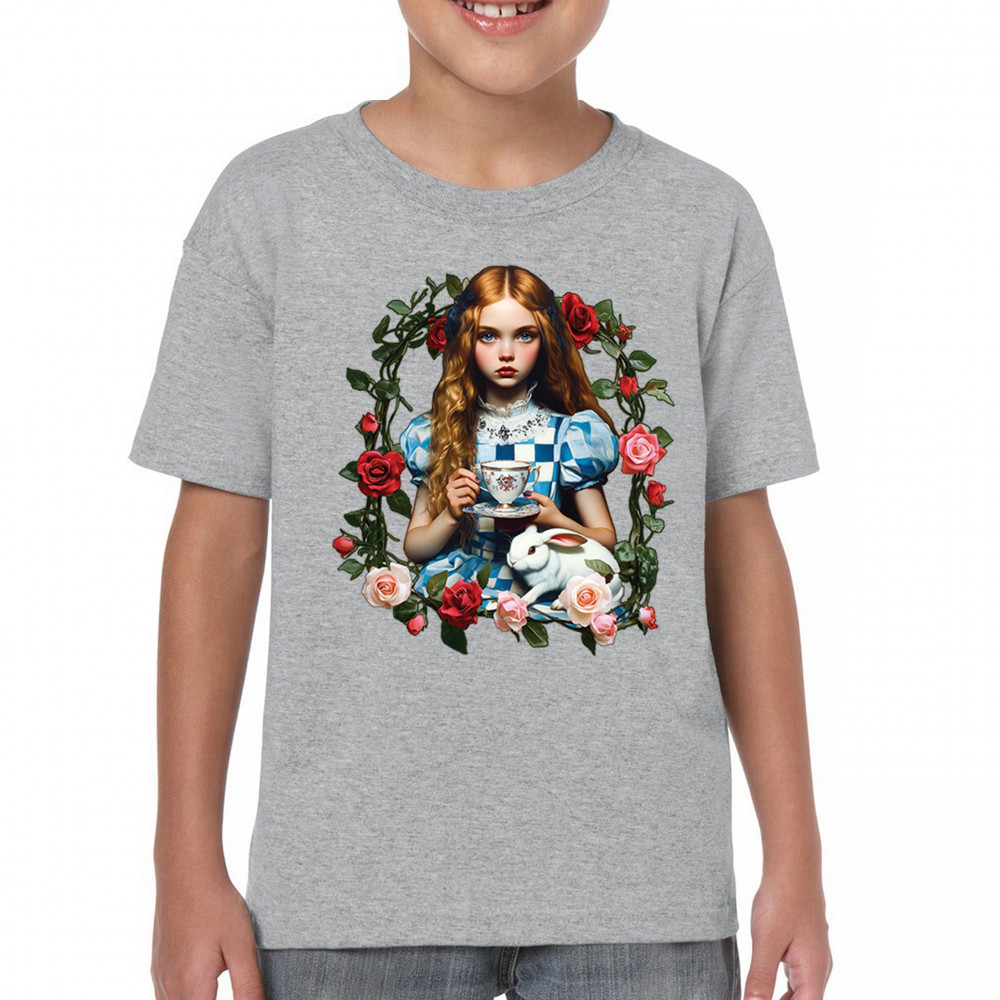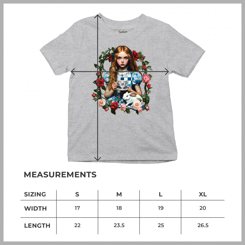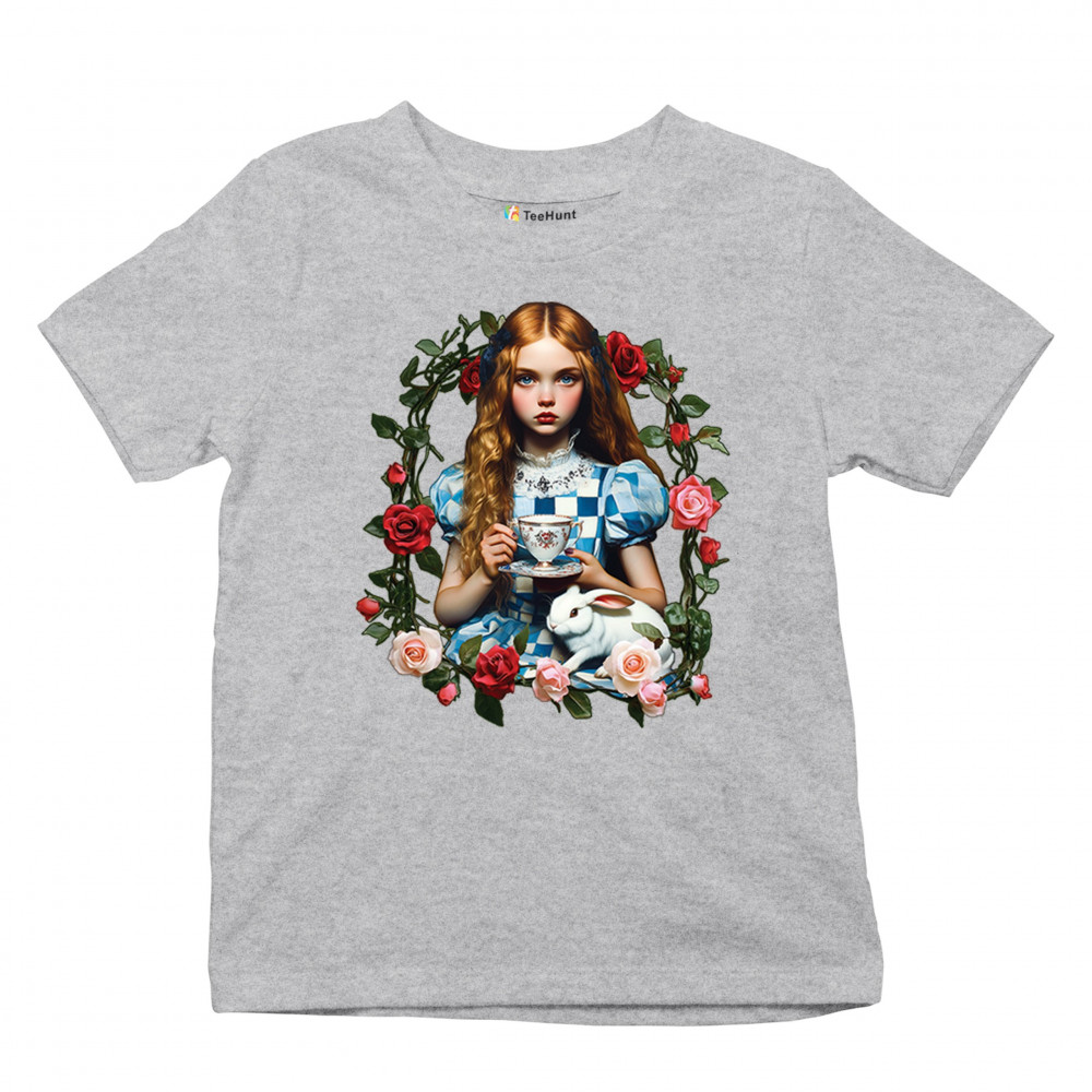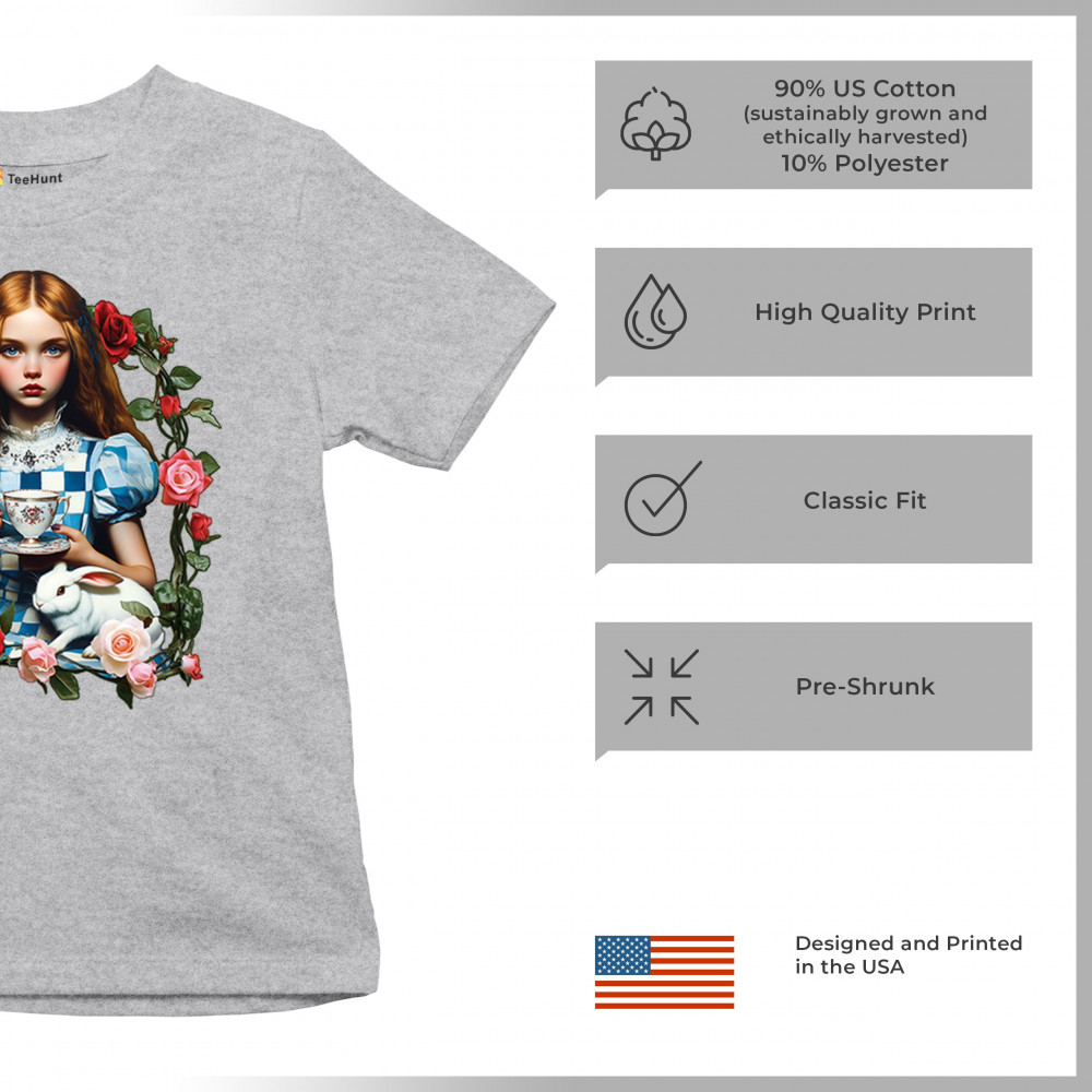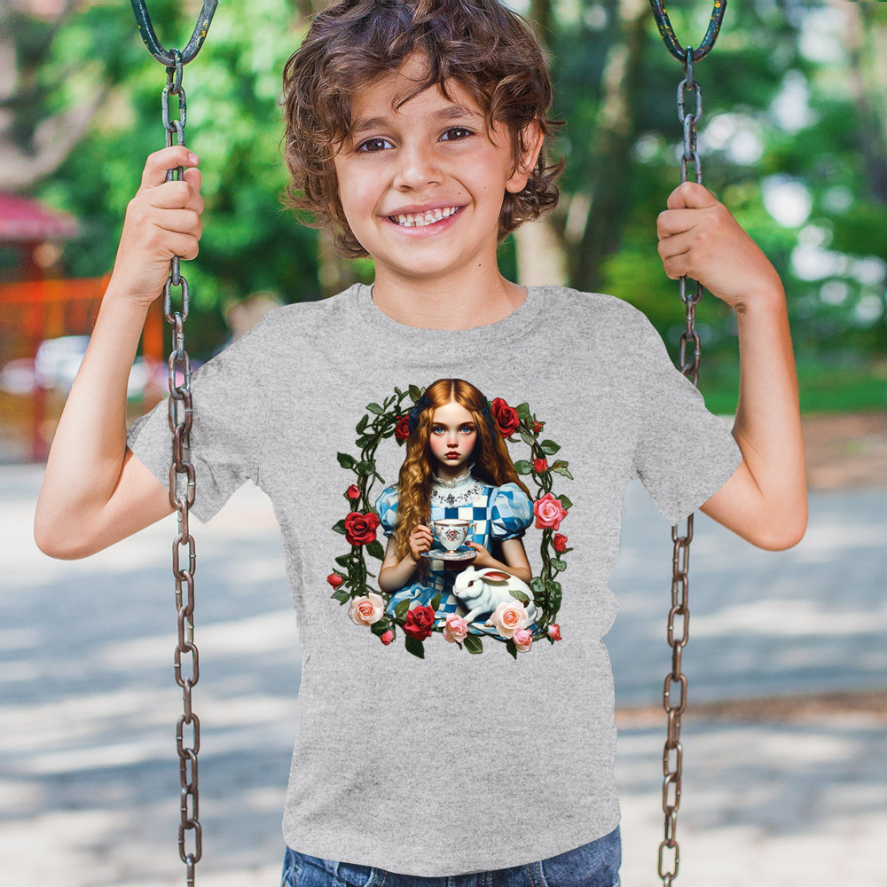 Step into a storybook dream with this Wonderland-inspired design featuring a young girl at a tea party with her white rabbit companion. Framed by roses, it evokes vintage charm, fantasy, and magical nostalgia. Ideal for bookworms, collectors, and lovers of fairytales, it blends whimsical elegance with timeless childhood wonder.