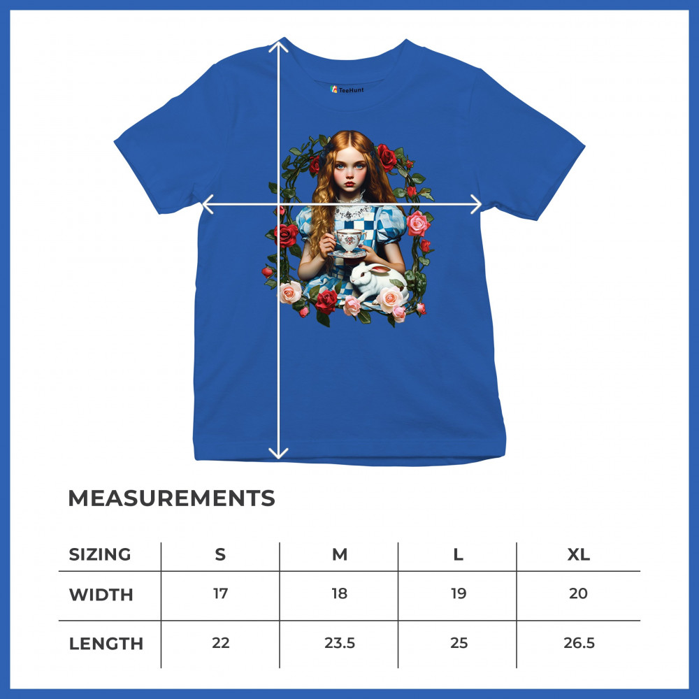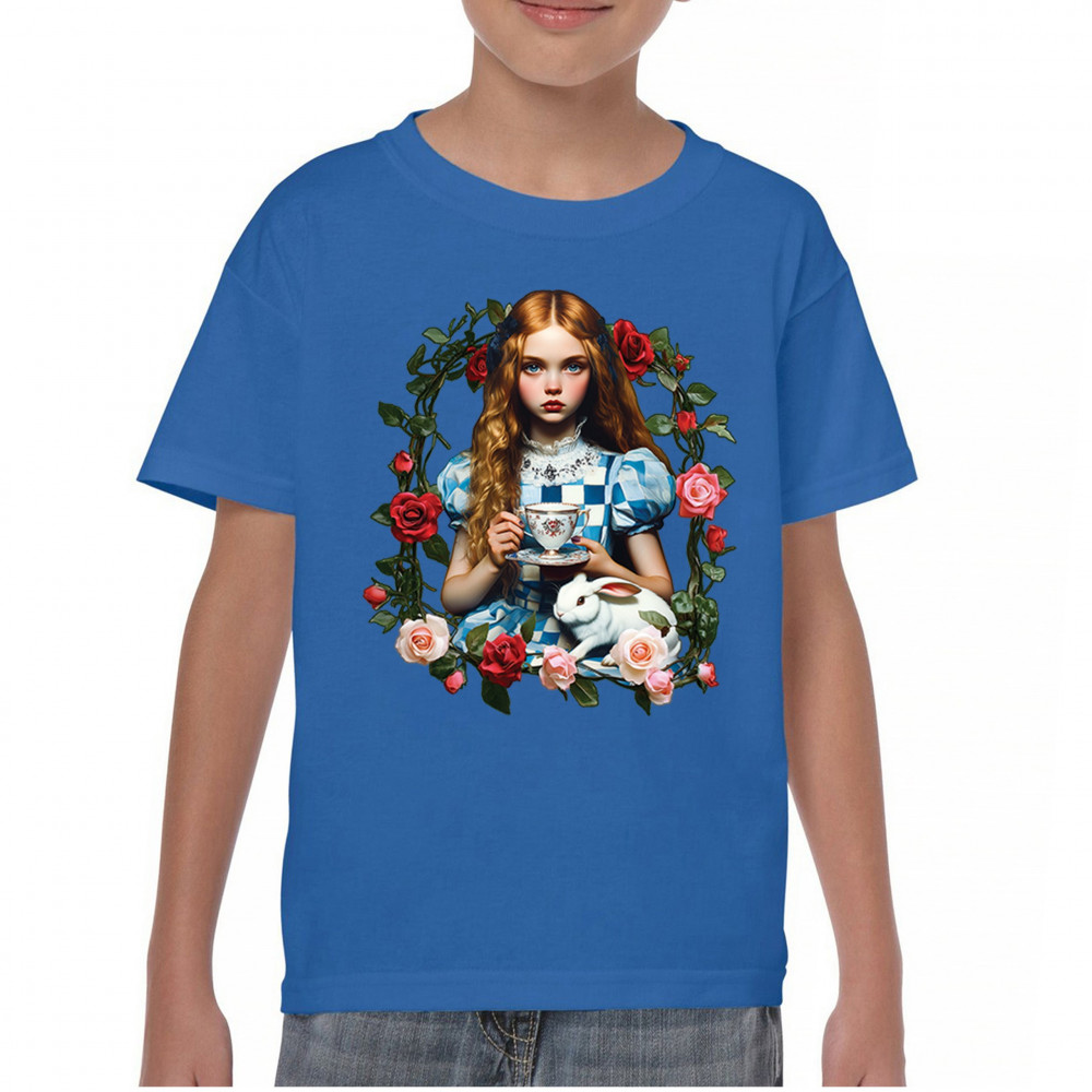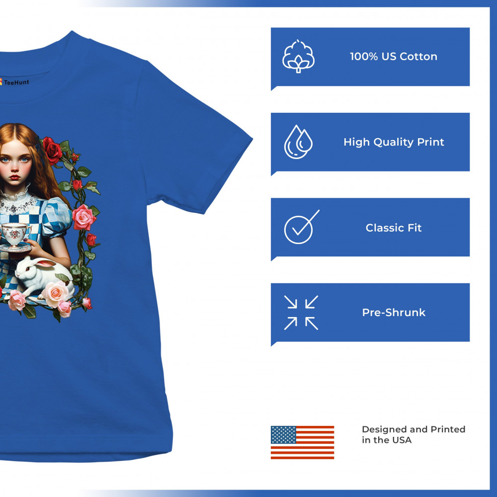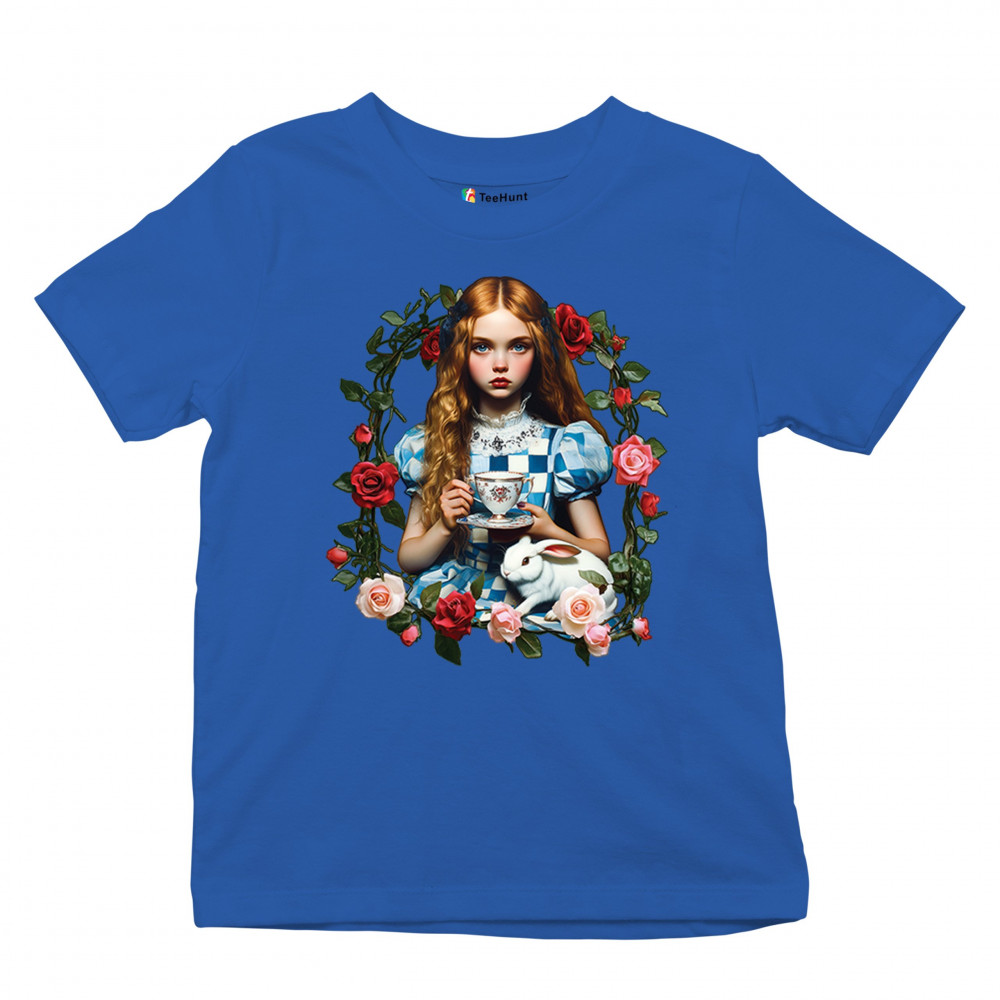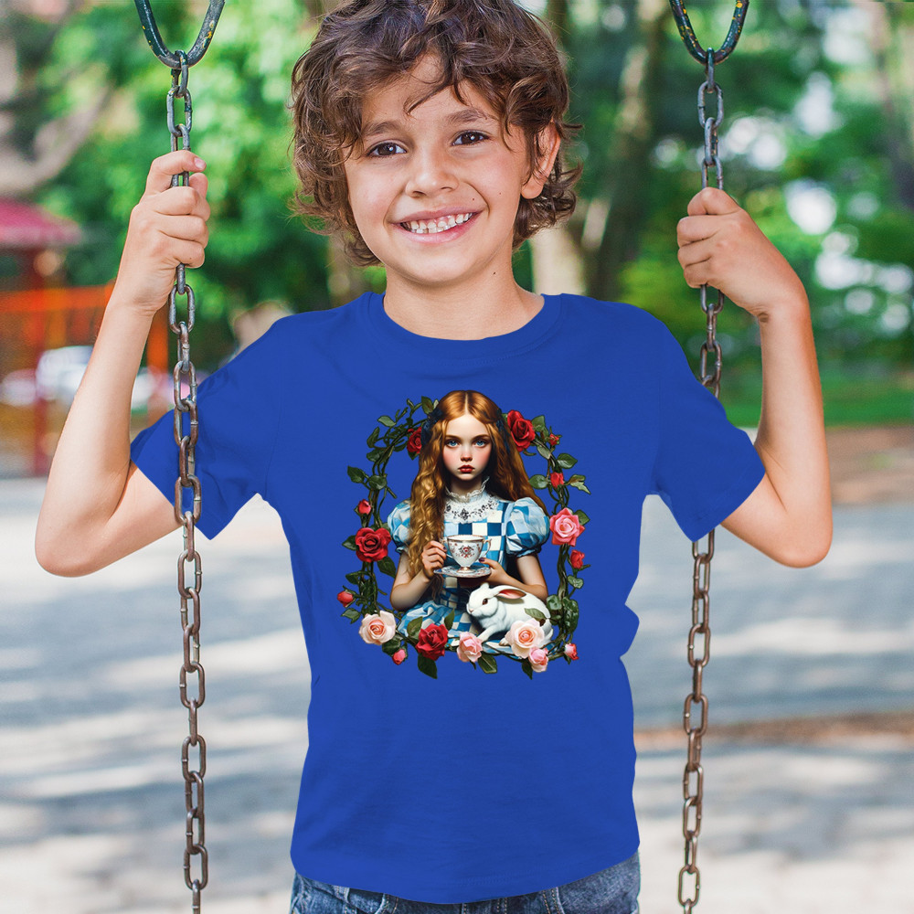 Step into a storybook dream with this Wonderland-inspired design featuring a young girl at a tea party with her white rabbit companion. Framed by roses, it evokes vintage charm, fantasy, and magical nostalgia. Ideal for bookworms, collectors, and lovers of fairytales, it blends whimsical elegance with timeless childhood wonder.