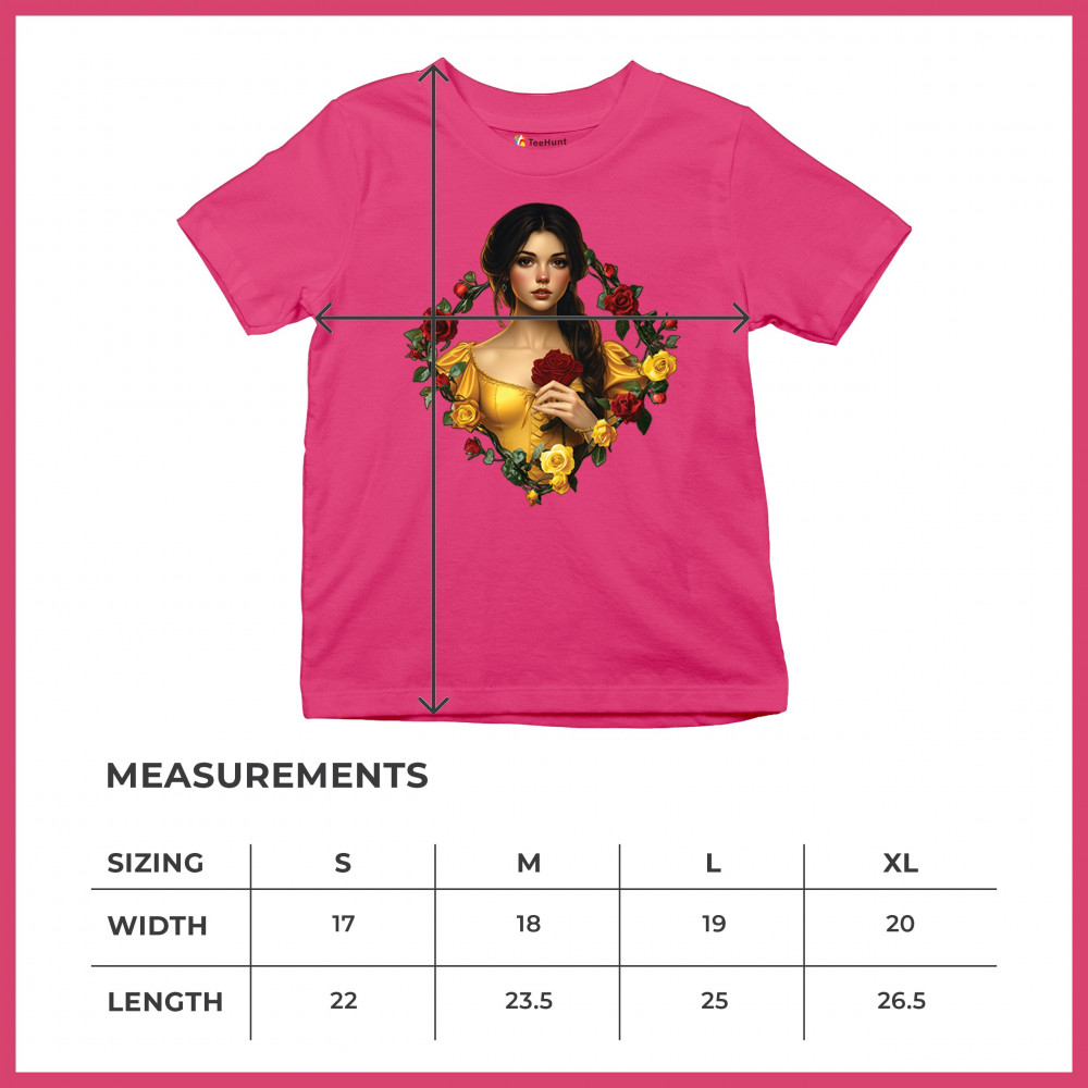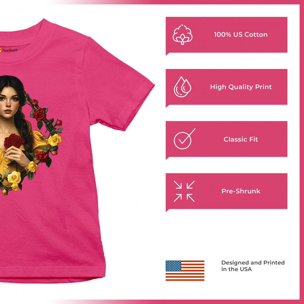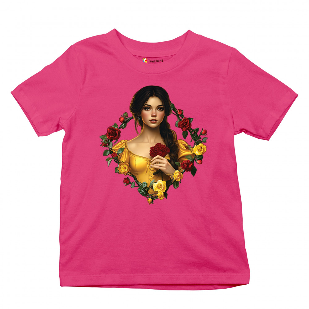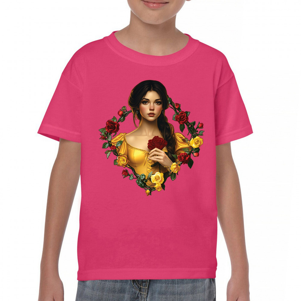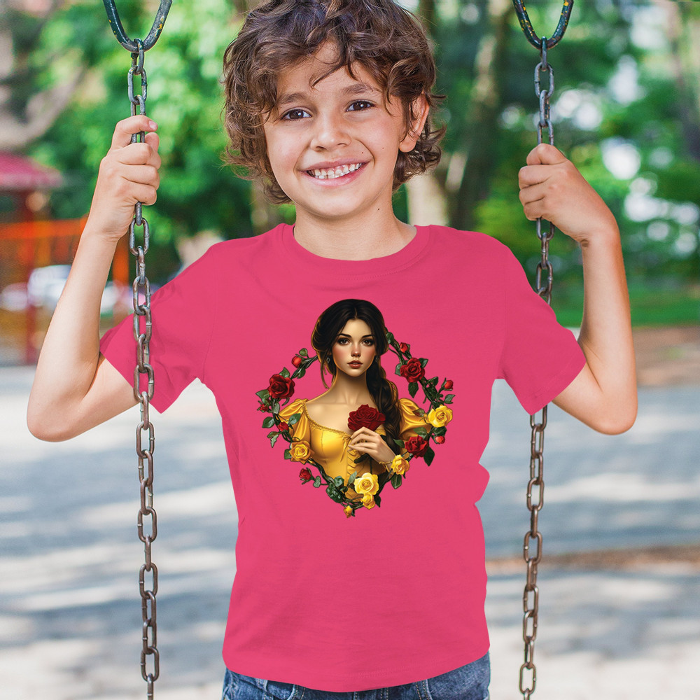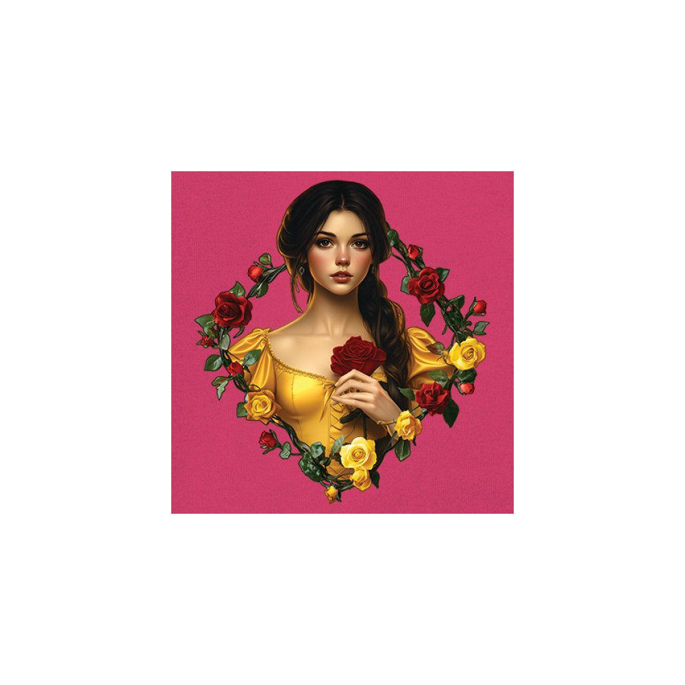 Inspired by classic fairytales, this design features a girl in a yellow gown holding a red rose, framed by rich red and yellow roses. A tribute to Beauty and the Beast, it radiates warmth, romance, and timeless fantasy. Perfect for storybook lovers, enchanted art collectors, or those drawn to magical, symbolic imagery filled with beauty and grace.
