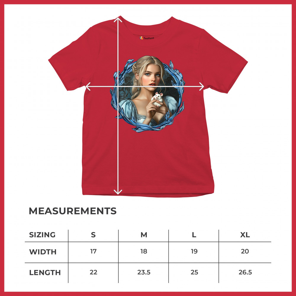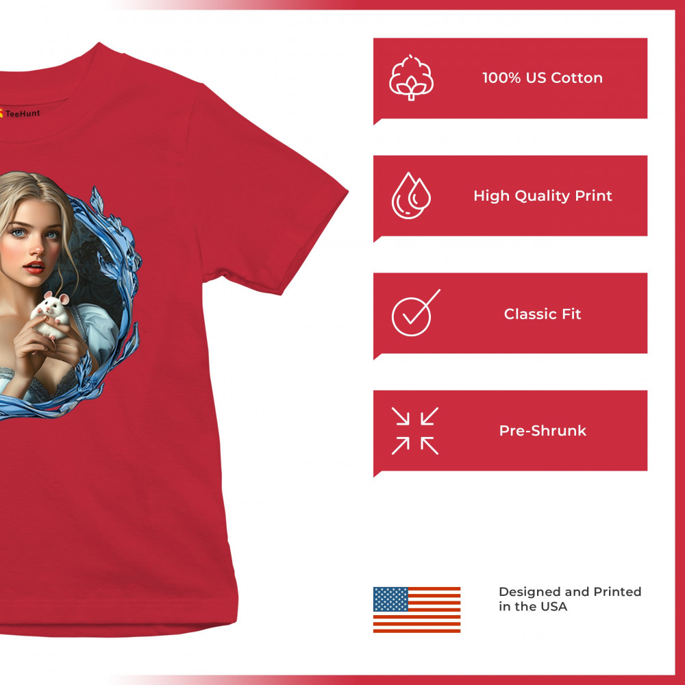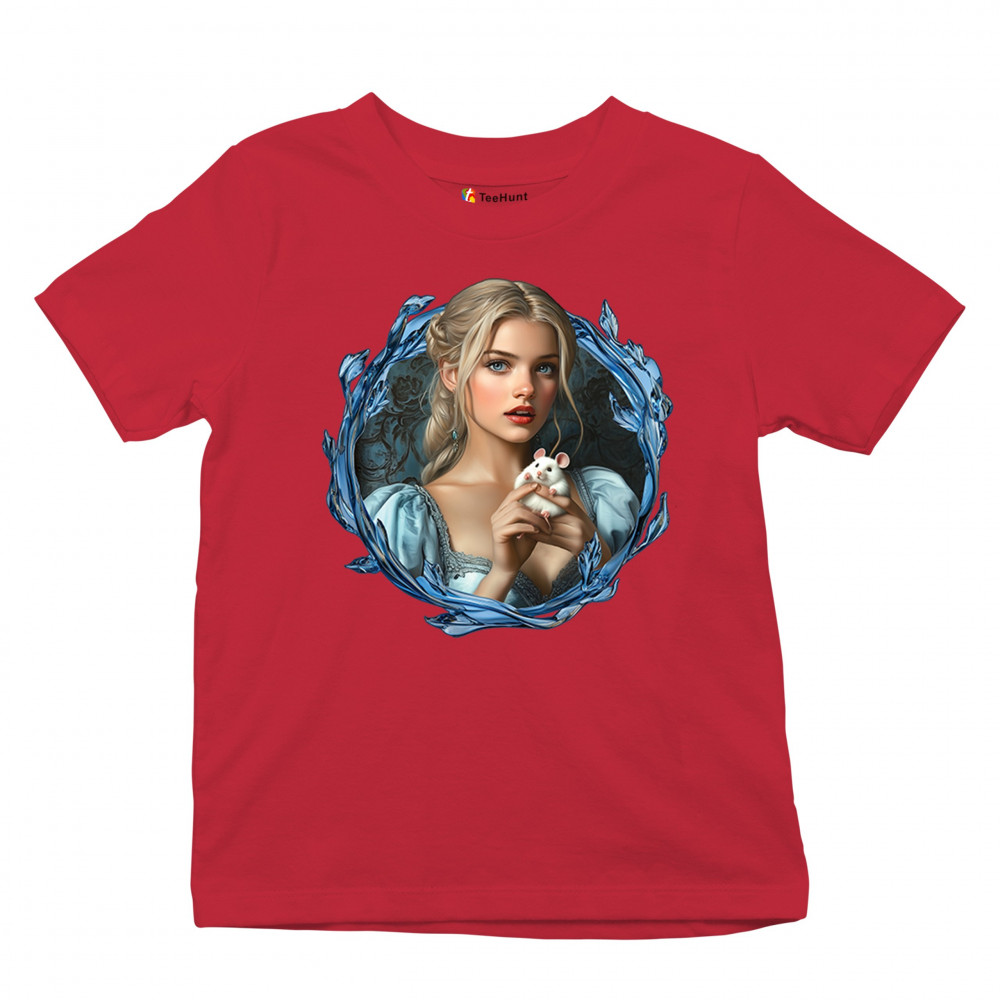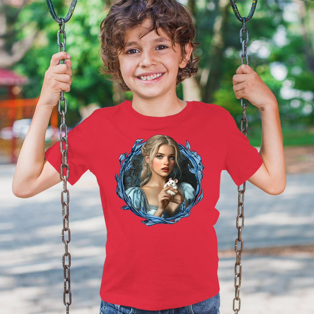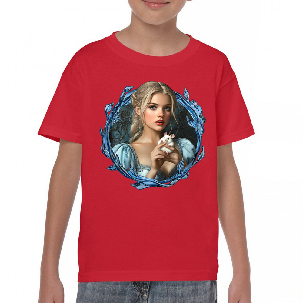A whimsical design inspired by fairytales and Cinderella magic, featuring a blonde girl in a blue dress holding a white mouse. The icy blue leaf frame evokes enchantment and transformation. With soft, vintage tones and a dreamy feel, it’s a charming tribute to kindness, fantasy, animal companionship, and gentle storytelling magic.