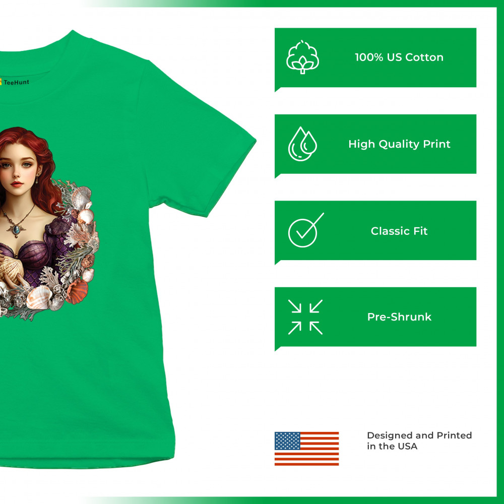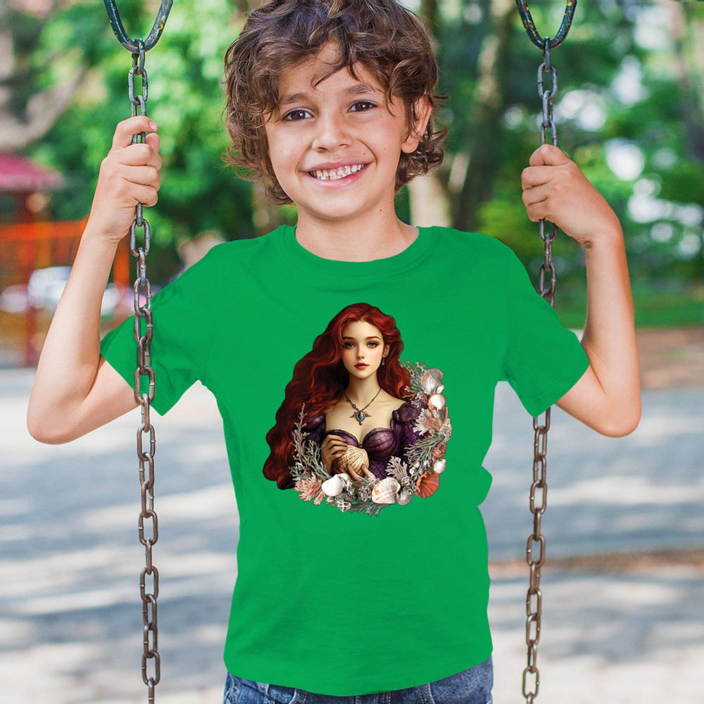 Fantasy mermaid design with red-haired girl, seashell dress, coral, and sea life. A dreamy tribute to marine magic and coastal fairytales.