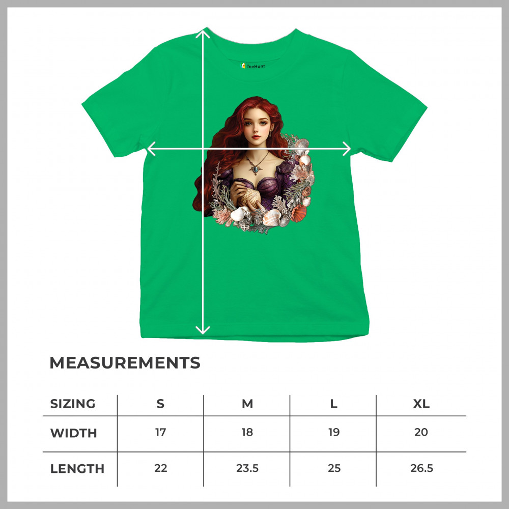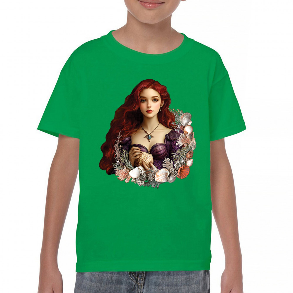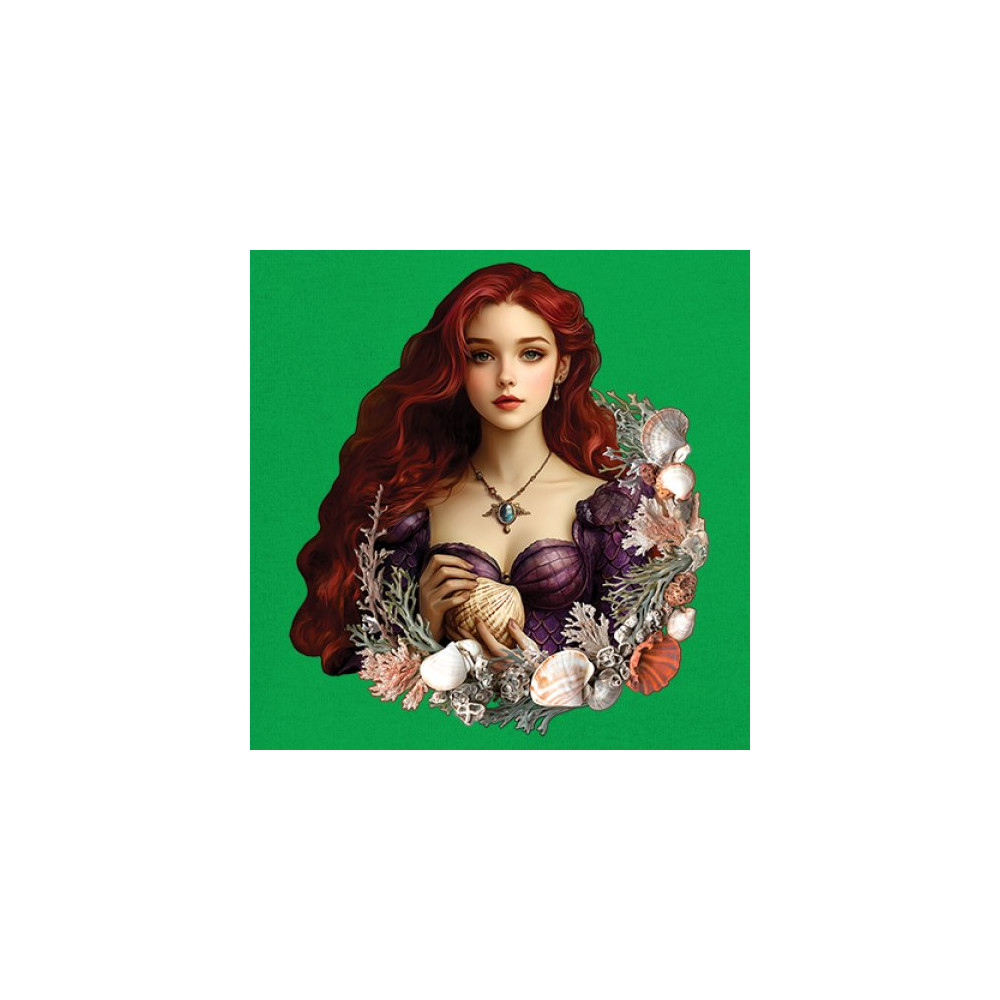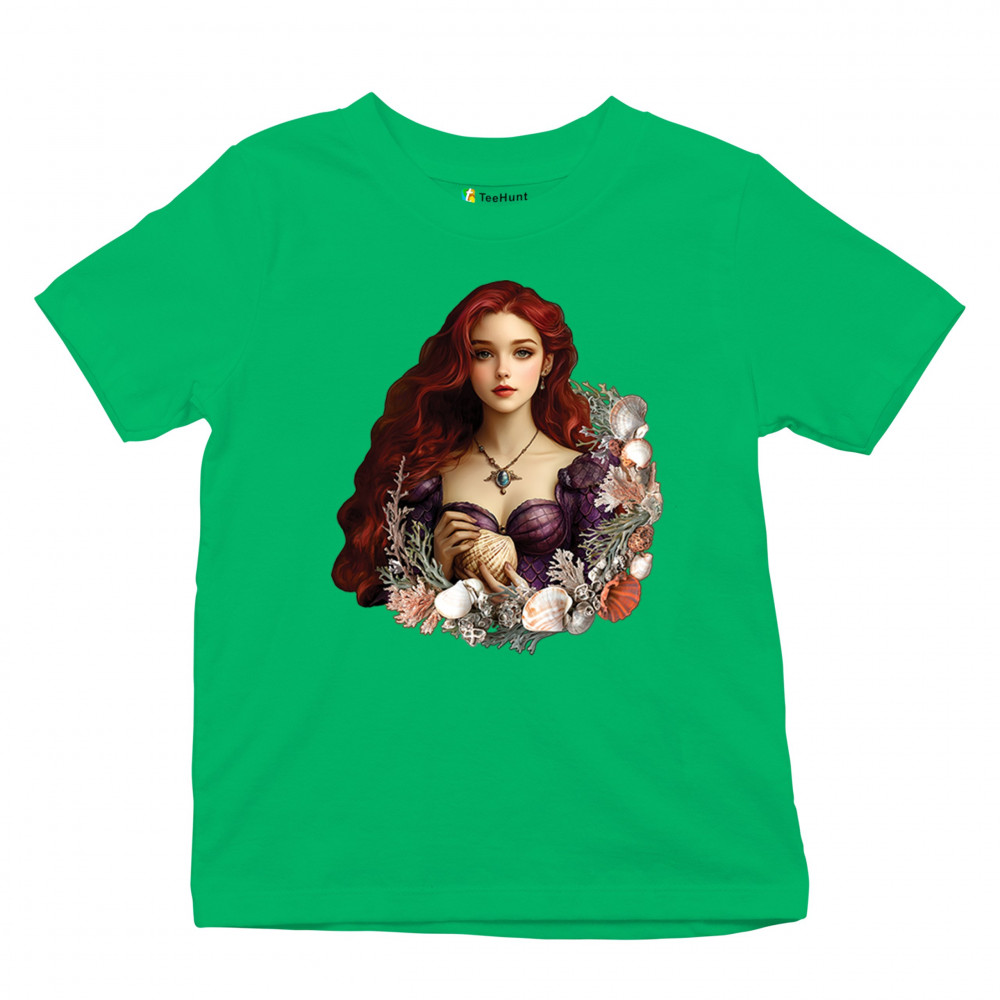 Inspired by mystical ocean themes, this design features a fantasy red-haired girl in a seashell dress, cradling a large shell. She is framed by coral, seaweed, and a shimmering array of ocean shells. With nods to classic mermaid lore and fairytale storytelling, it's perfect for fans of fantasy creatures, marine magic, and romantic ocean legends.