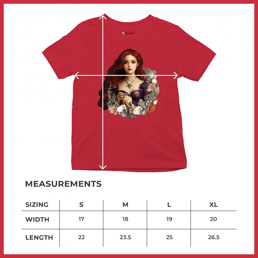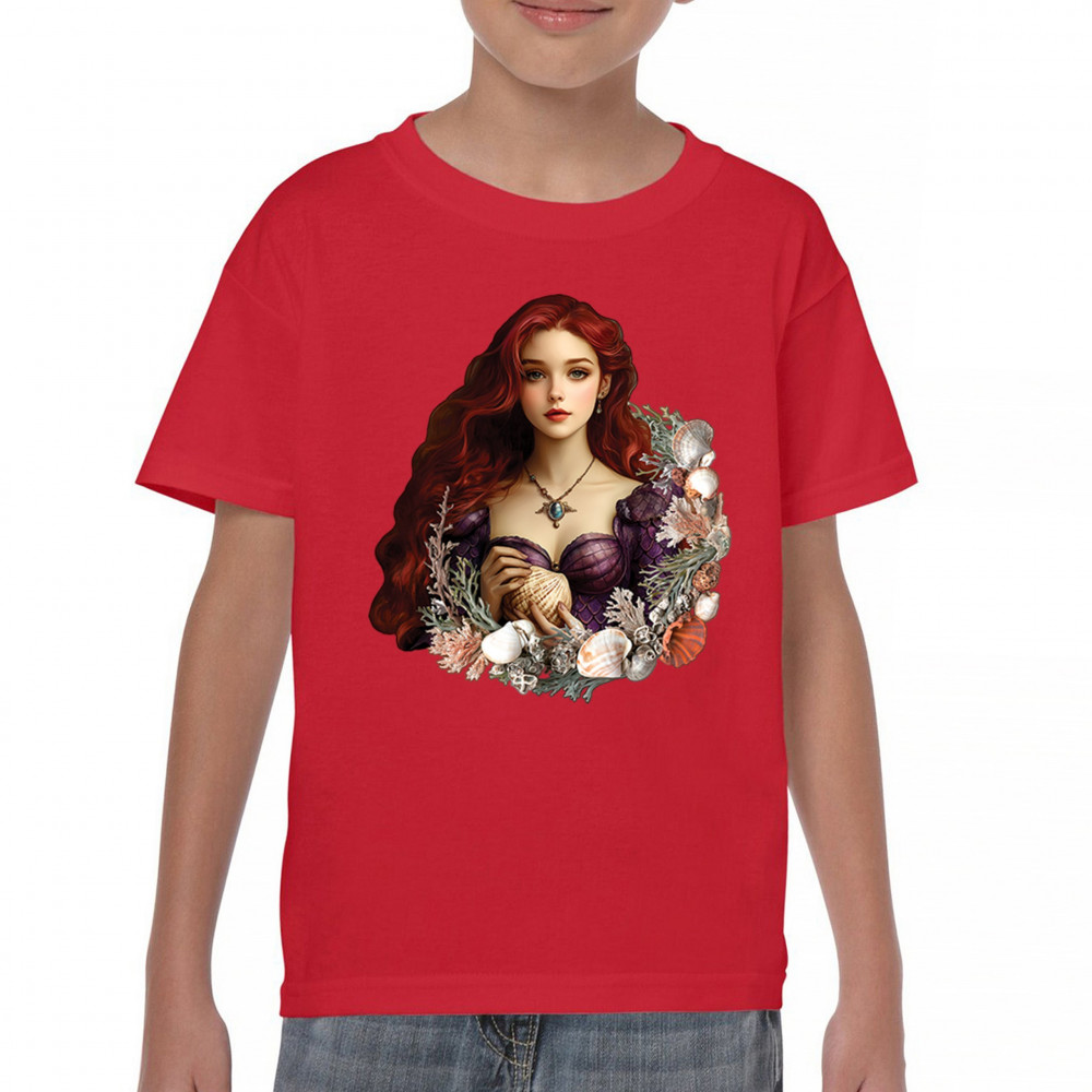 Inspired by mystical ocean themes, this design features a fantasy red-haired girl in a seashell dress, cradling a large shell. She is framed by coral, seaweed, and a shimmering array of ocean shells. With nods to classic mermaid lore and fairytale storytelling, it's perfect for fans of fantasy creatures, marine magic, and romantic ocean legends.