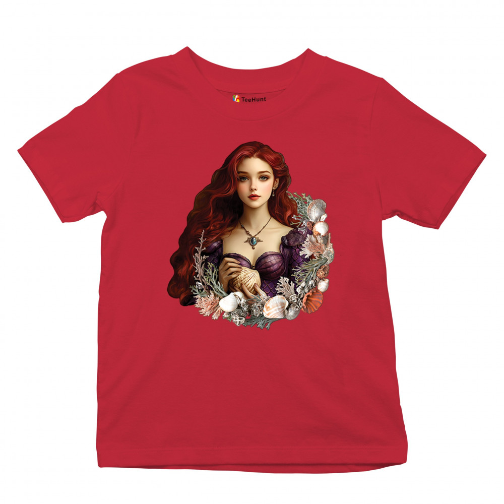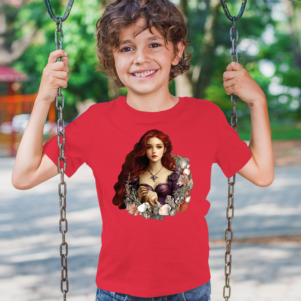 Fantasy mermaid design with red-haired girl, seashell dress, coral, and sea life. A dreamy tribute to marine magic and coastal fairytales.