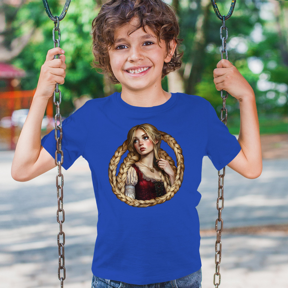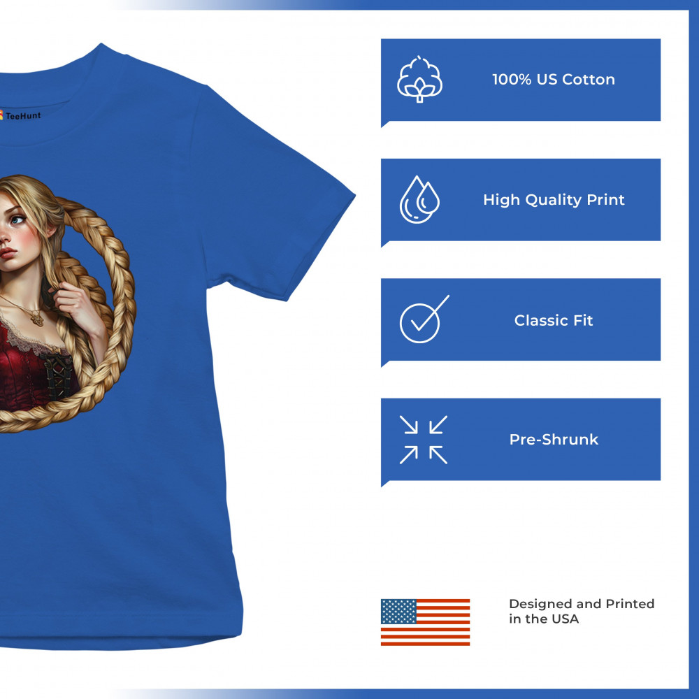 A dreamy design featuring a blonde girl with long braided hair encircling her like a frame. With vintage dress details and a wistful look, this artwork channels the essence of fairytales, romantic legends, and gentle feminine power. Ideal for fantasy lovers, folklore fans, and collectors of magical storybook themes.