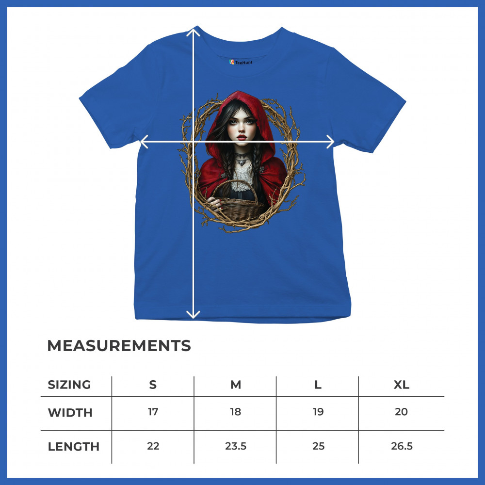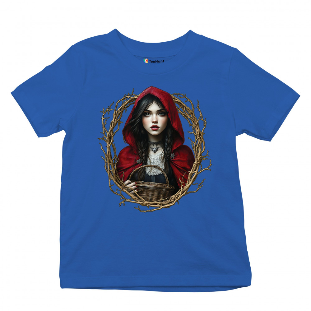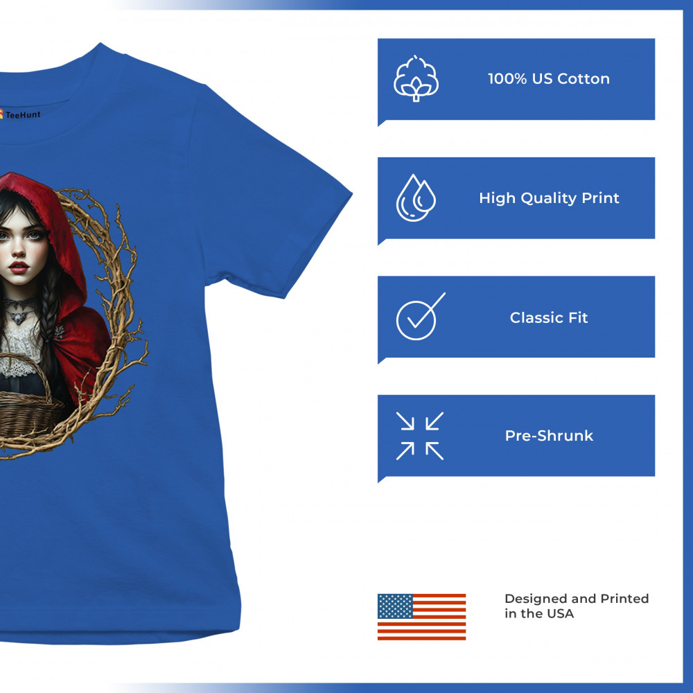 Step into a shadowy fairytale with this gothic design featuring a red-cloaked girl and twisted forest branches. Evoking themes from Red Riding Hood and folklore magic, it’s rich in fantasy, mystery, and dark aesthetic. Perfect for fantasy lovers, dark romantics, and storybook dreamers drawn to enchanted paths and eerie tales.
