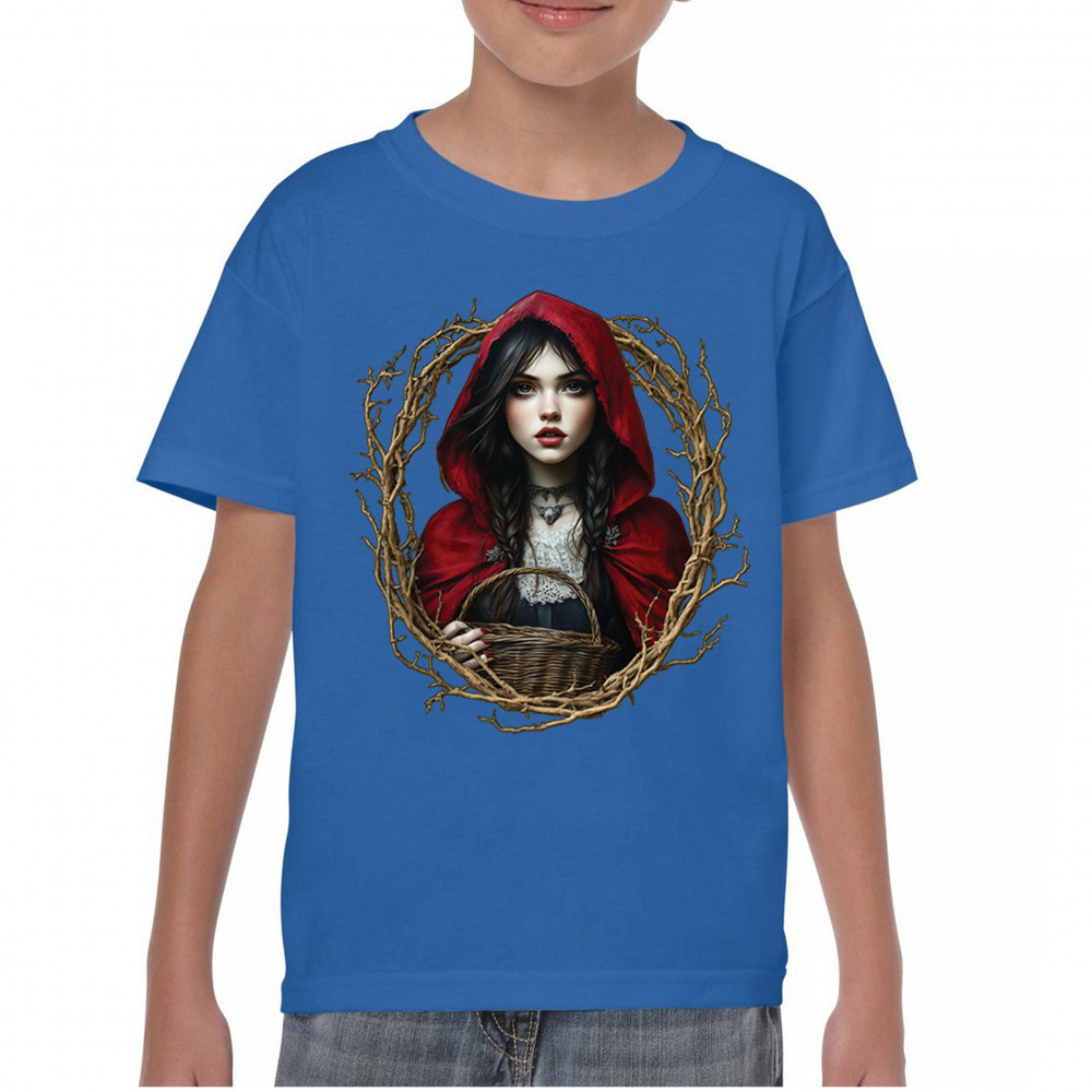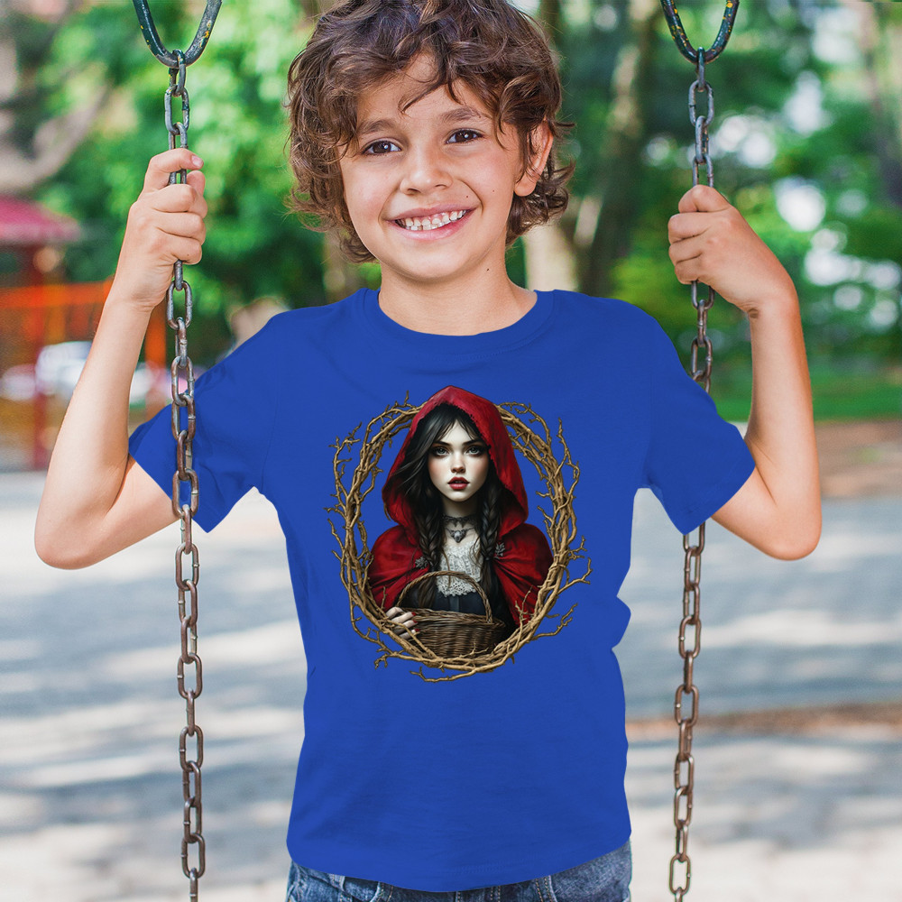 Gothic fairytale design with red cloak, forest branches, and moody magic. A dark, enchanting look for fantasy fans and folklore lovers.