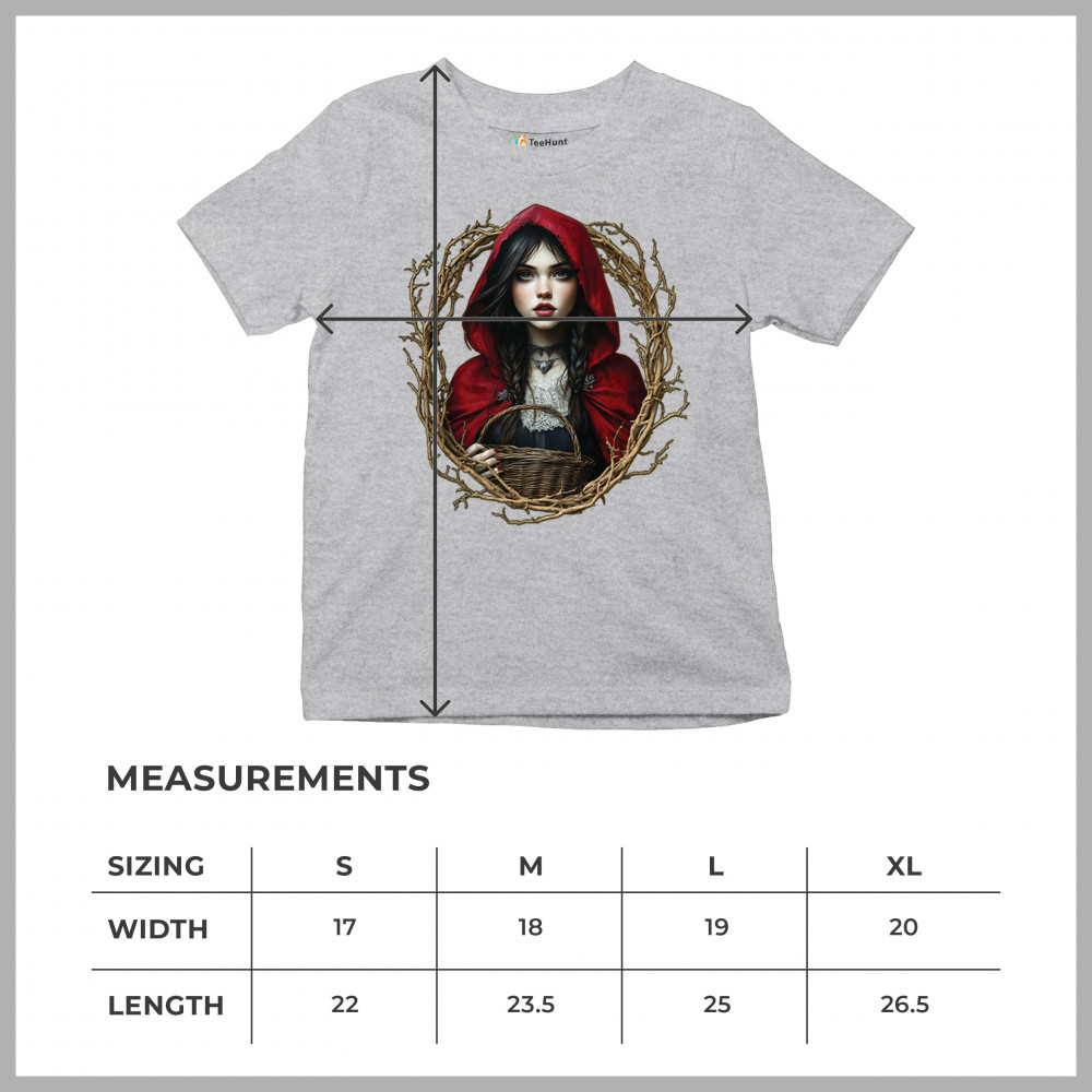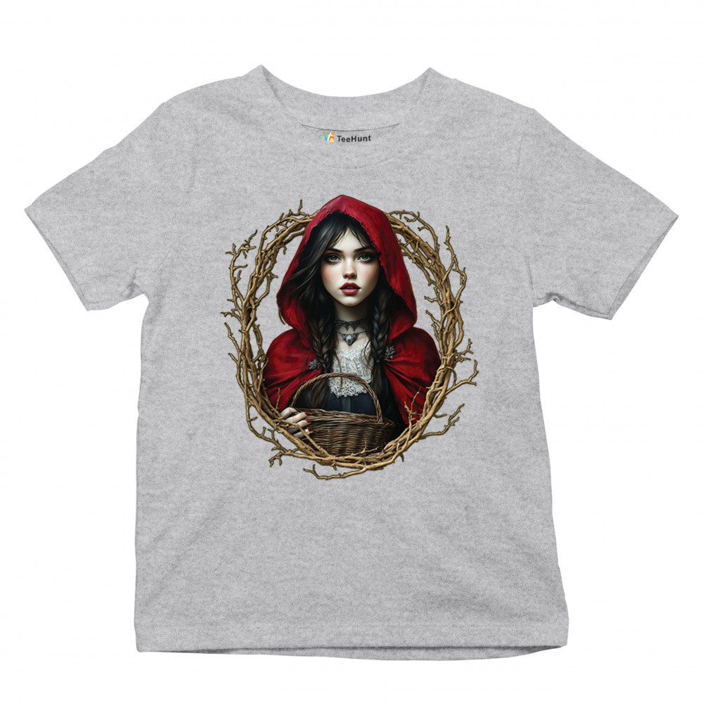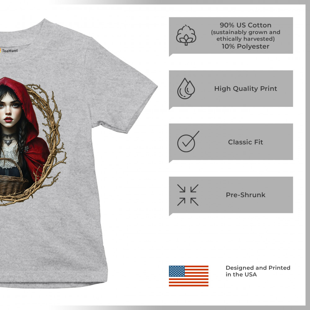 Step into a shadowy fairytale with this gothic design featuring a red-cloaked girl and twisted forest branches. Evoking themes from Red Riding Hood and folklore magic, it’s rich in fantasy, mystery, and dark aesthetic. Perfect for fantasy lovers, dark romantics, and storybook dreamers drawn to enchanted paths and eerie tales.