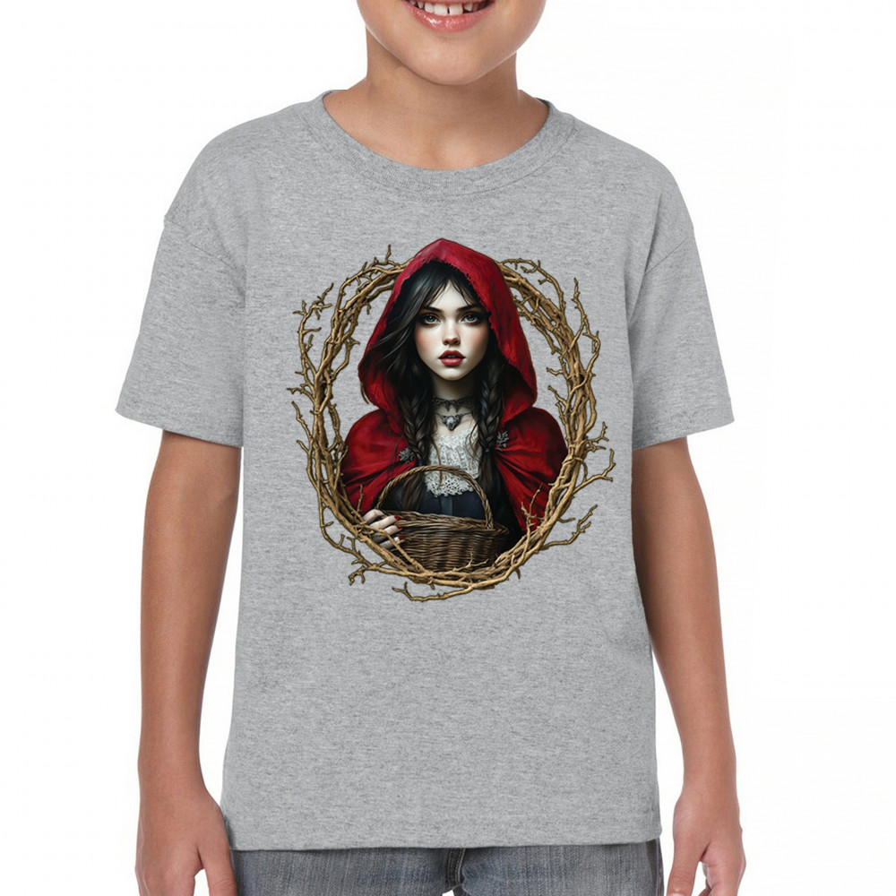 Gothic fairytale design with red cloak, forest branches, and moody magic. A dark, enchanting look for fantasy fans and folklore lovers.