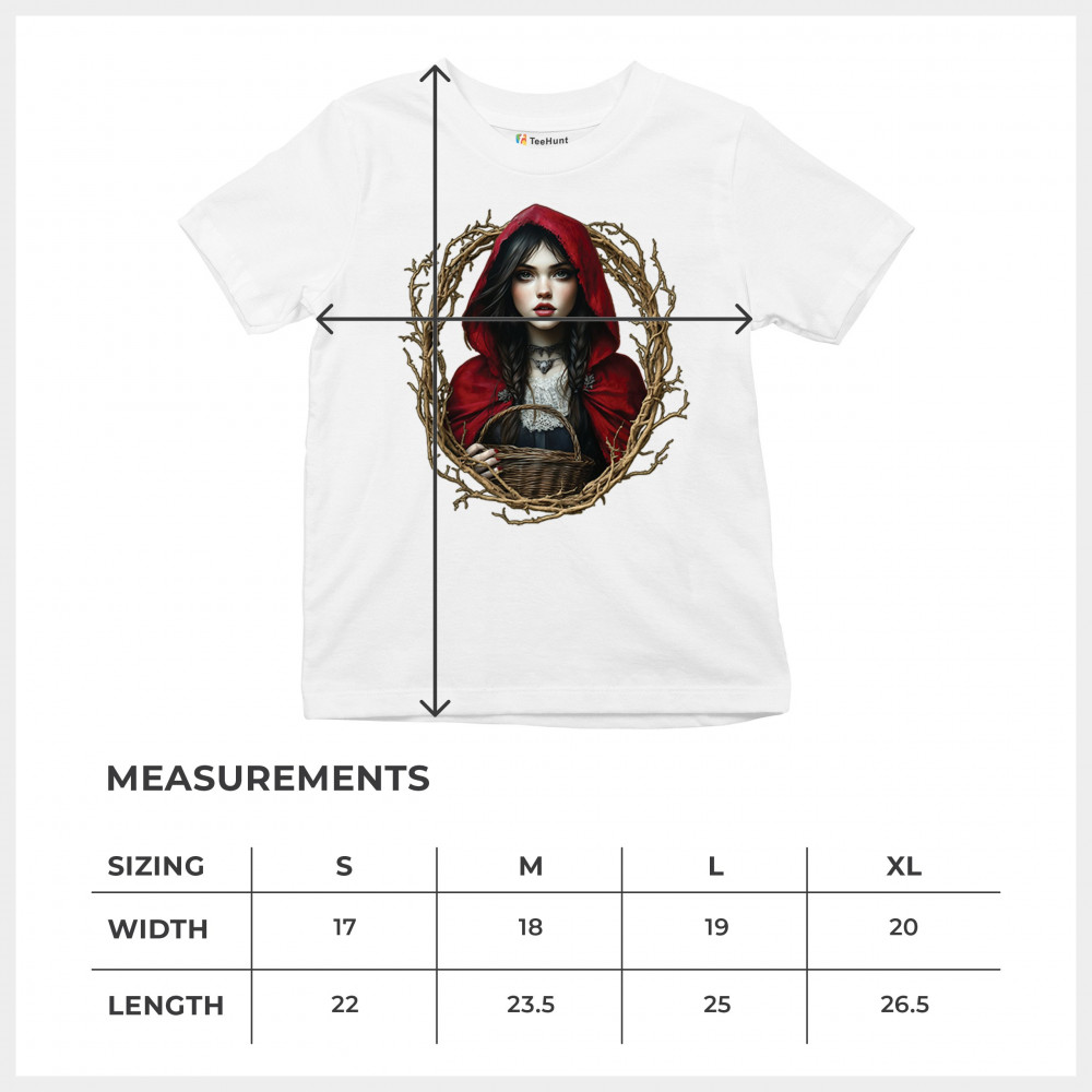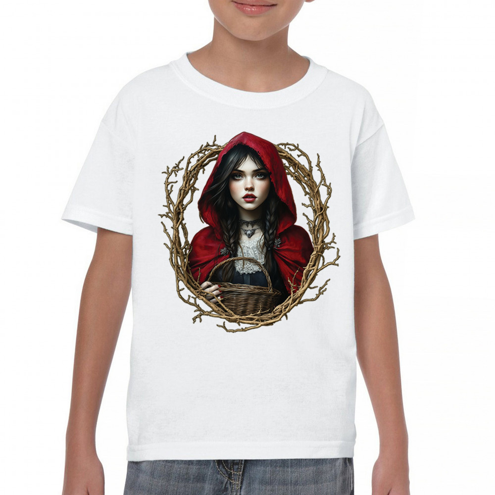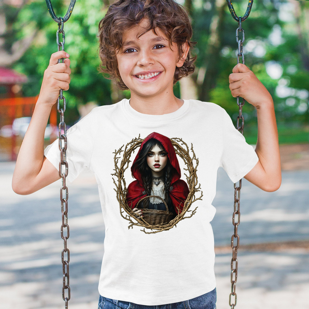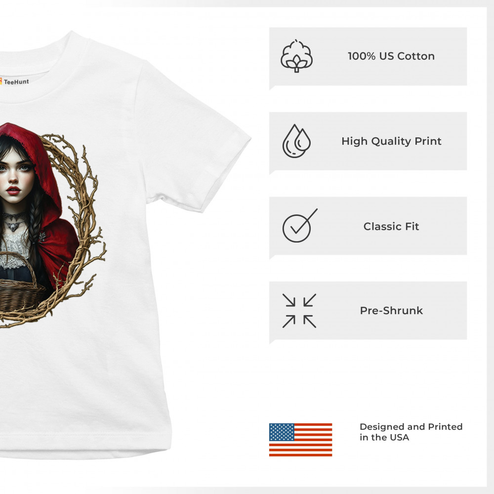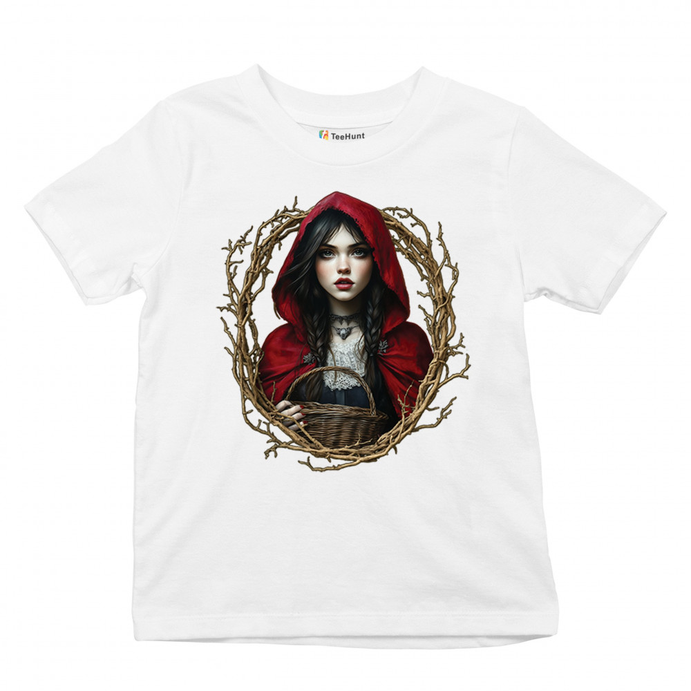Step into a shadowy fairytale with this gothic design featuring a red-cloaked girl and twisted forest branches. Evoking themes from Red Riding Hood and folklore magic, it’s rich in fantasy, mystery, and dark aesthetic. Perfect for fantasy lovers, dark romantics, and storybook dreamers drawn to enchanted paths and eerie tales.