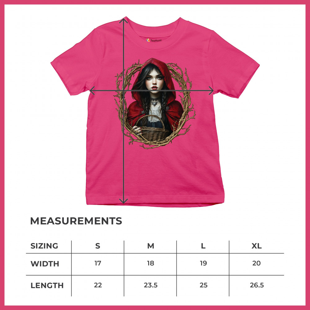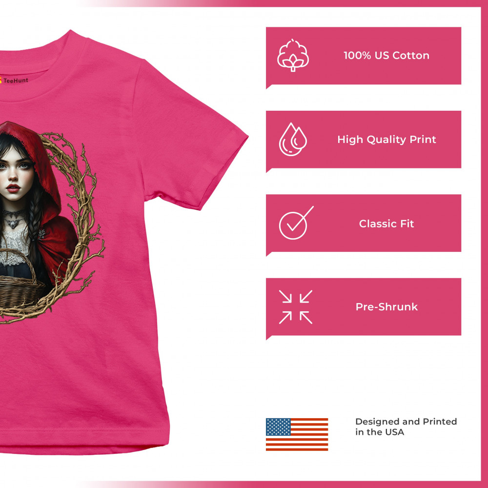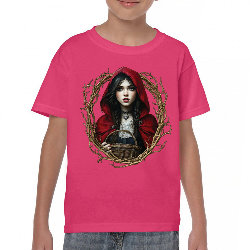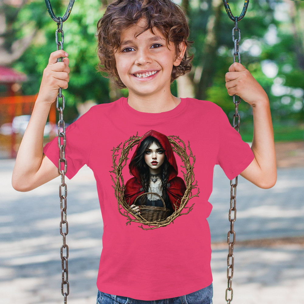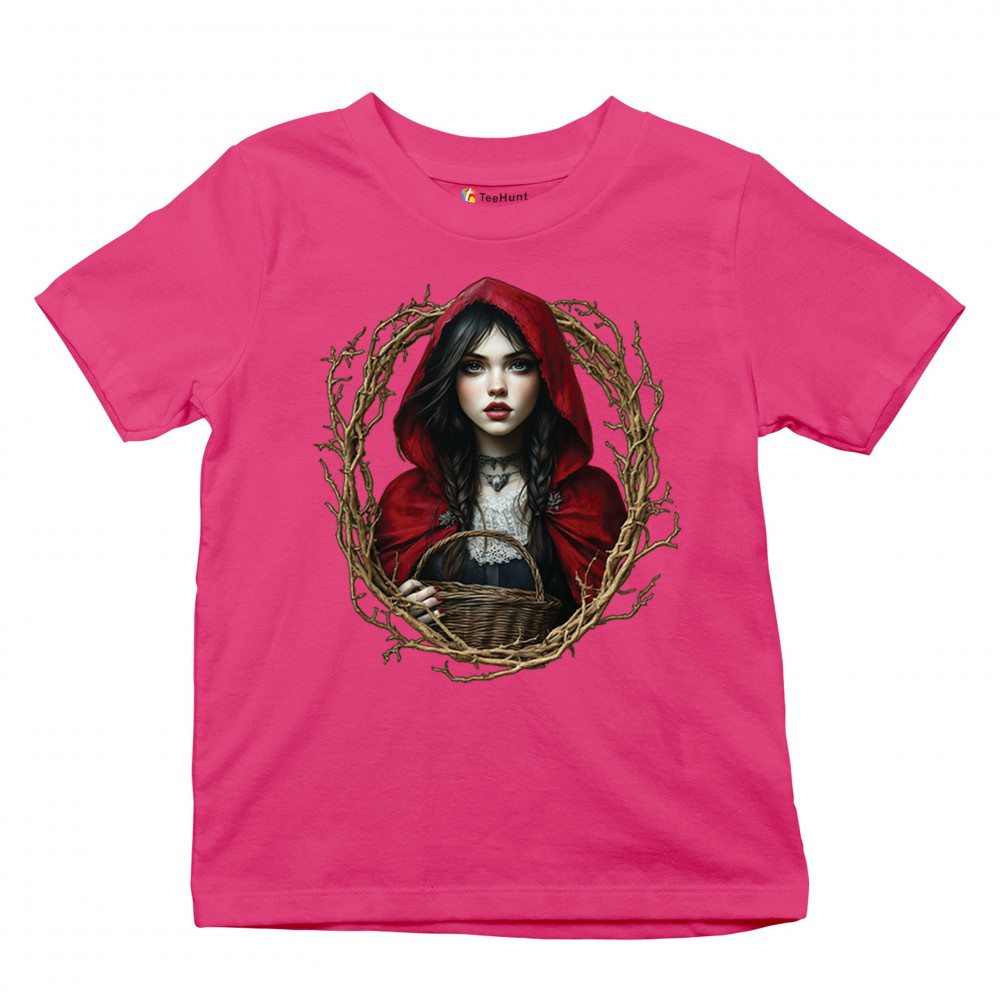 Step into a shadowy fairytale with this gothic design featuring a red-cloaked girl and twisted forest branches. Evoking themes from Red Riding Hood and folklore magic, it’s rich in fantasy, mystery, and dark aesthetic. Perfect for fantasy lovers, dark romantics, and storybook dreamers drawn to enchanted paths and eerie tales.