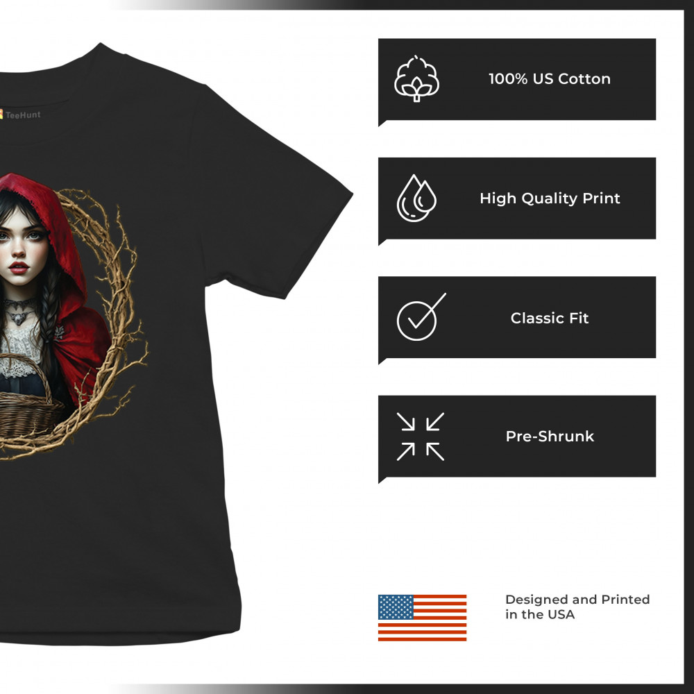Step into a shadowy fairytale with this gothic design featuring a red-cloaked girl and twisted forest branches. Evoking themes from Red Riding Hood and folklore magic, it’s rich in fantasy, mystery, and dark aesthetic. Perfect for fantasy lovers, dark romantics, and storybook dreamers drawn to enchanted paths and eerie tales.