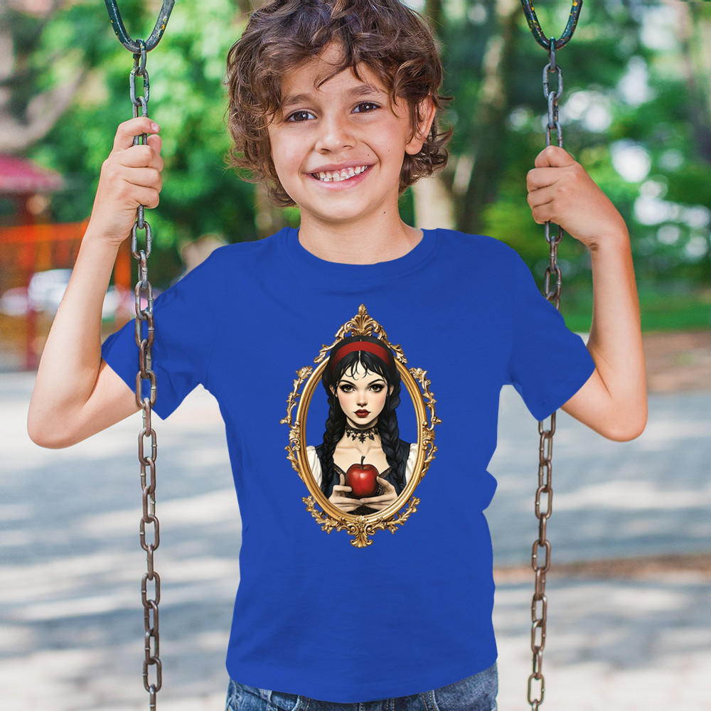 Dark fairytale design with red apple, gold frame, and Snow White vibes. A dreamy blend of fantasy, gothic style, and magical storytelling.