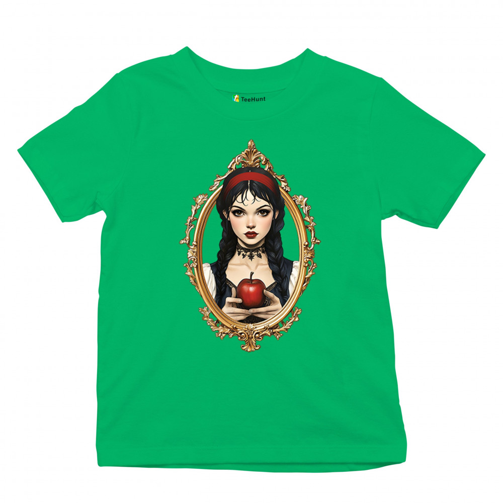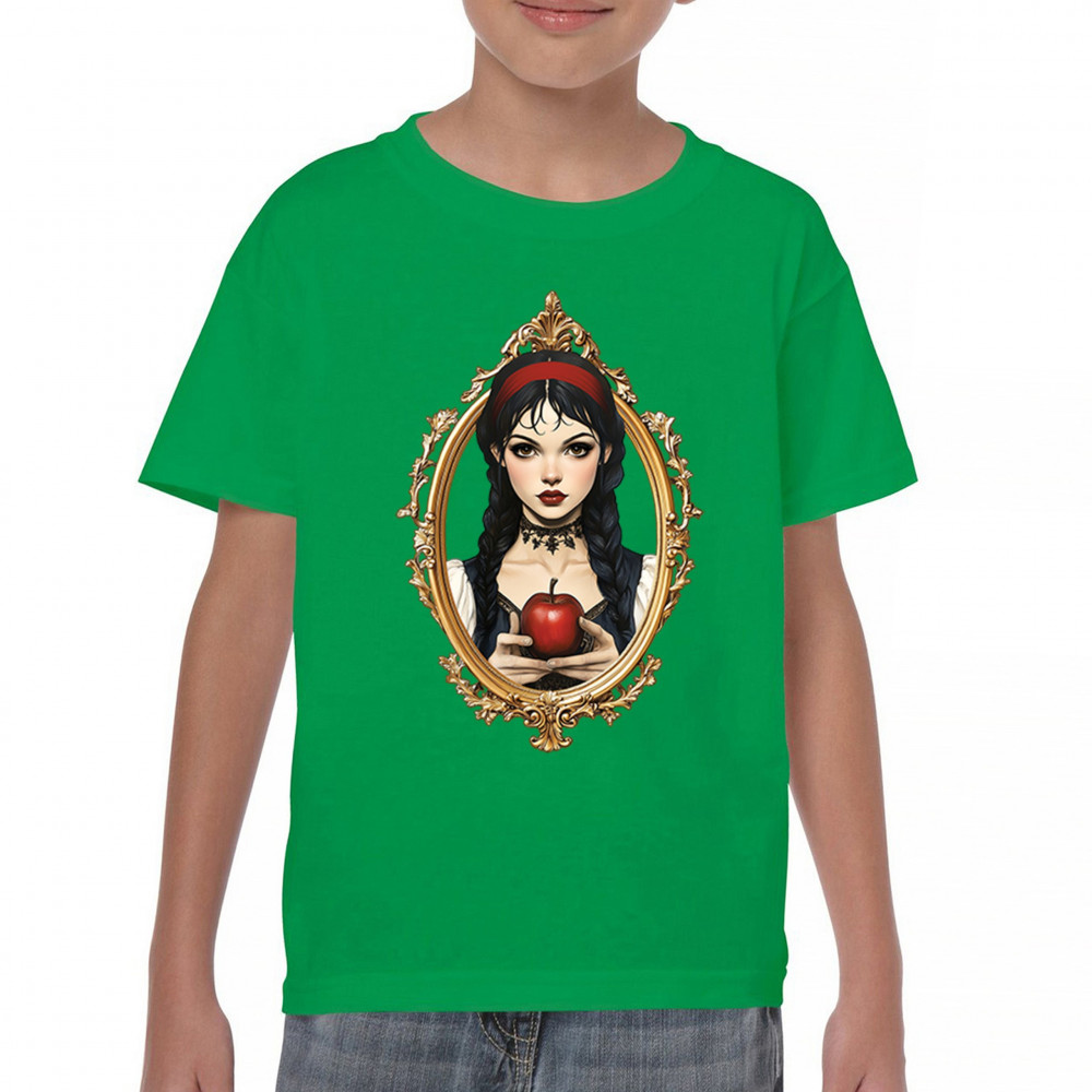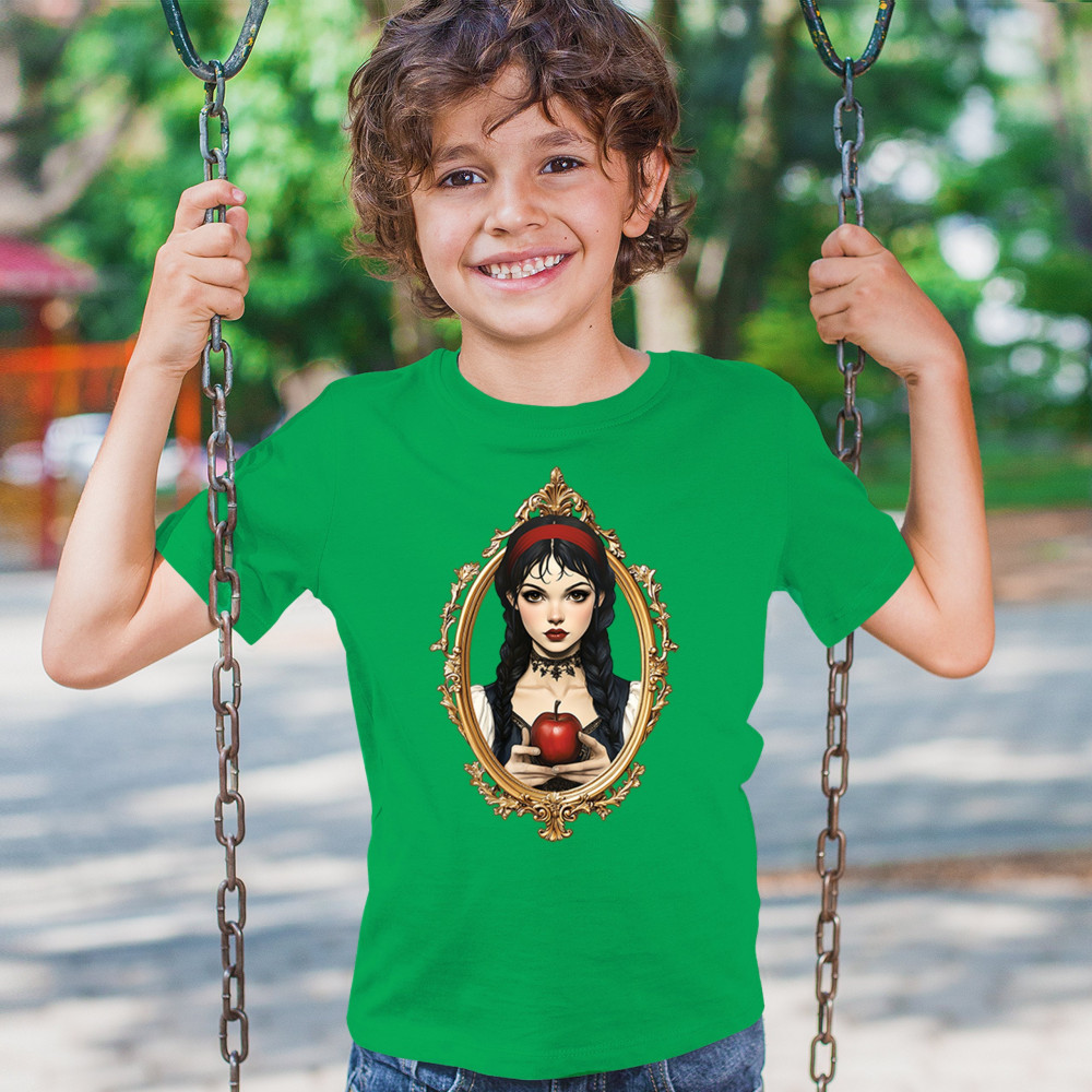 Dark fairytale design with red apple, gold frame, and Snow White vibes. A dreamy blend of fantasy, gothic style, and magical storytelling.