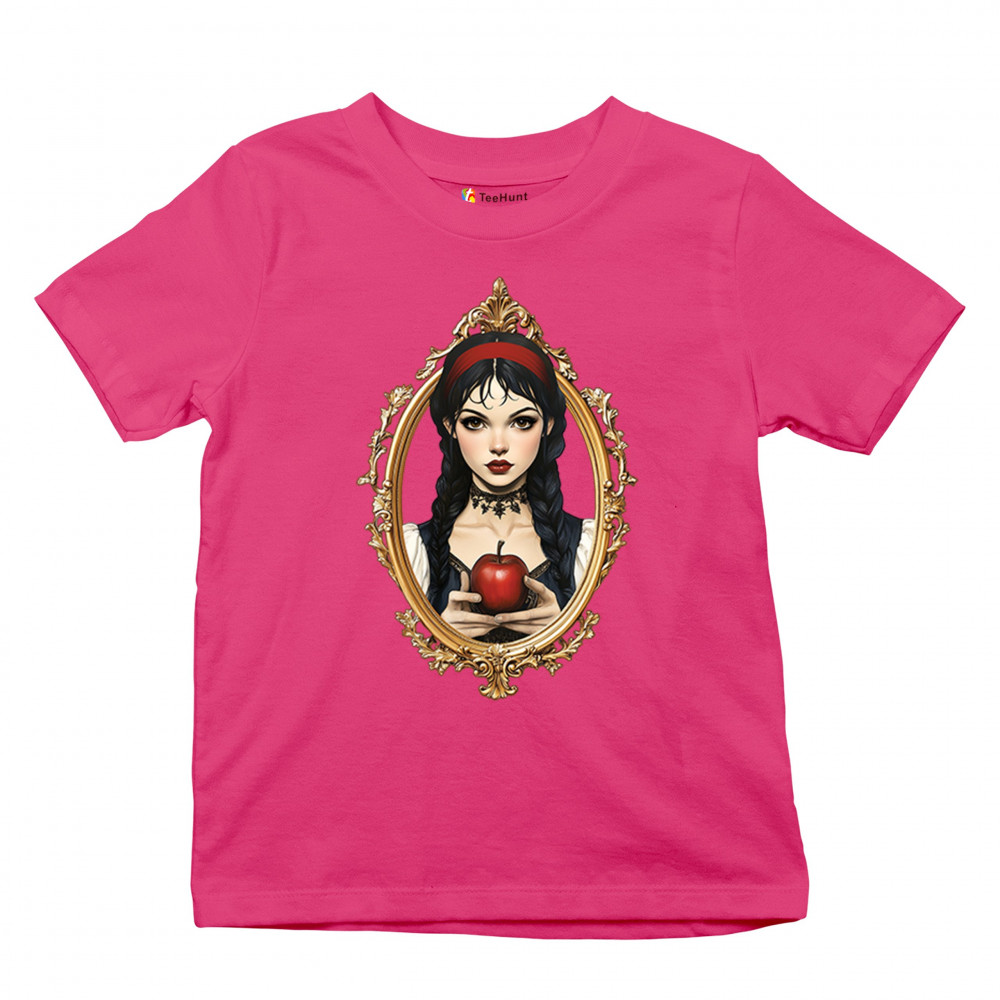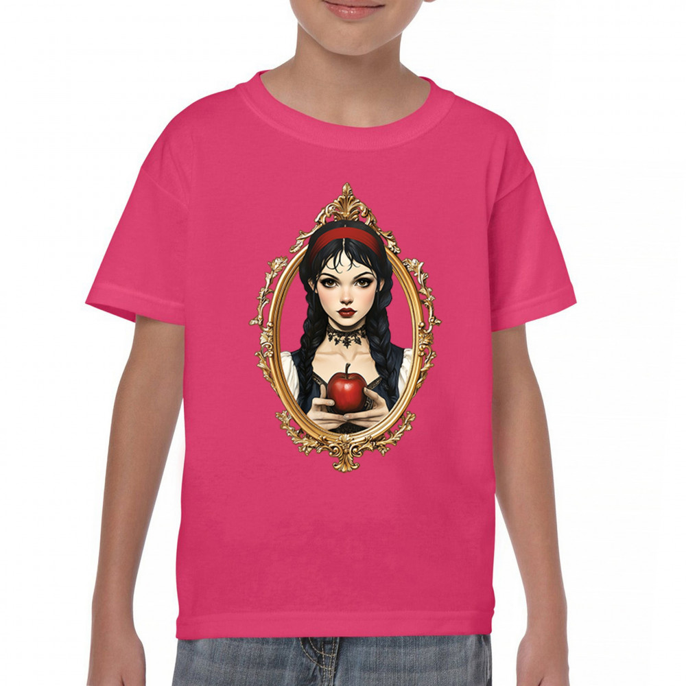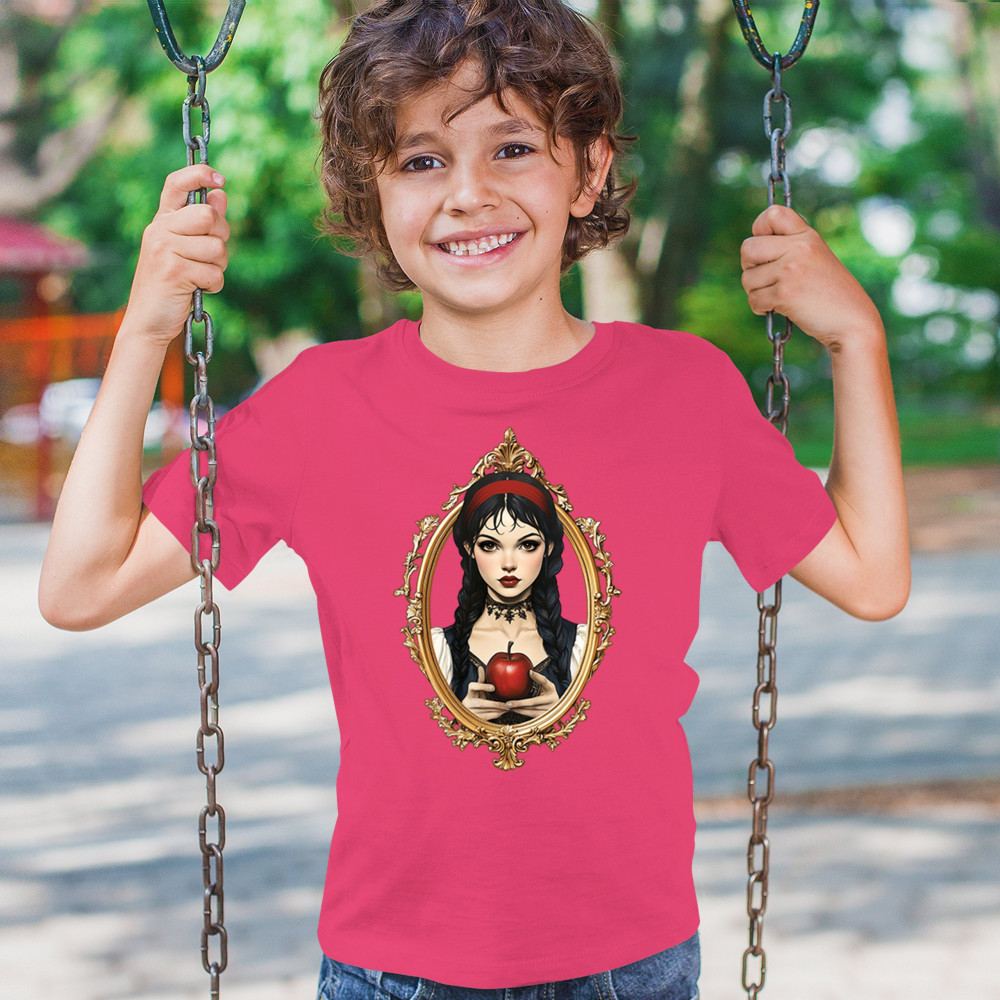 Dark fairytale design with red apple, gold frame, and Snow White vibes. A dreamy blend of fantasy, gothic style, and magical storytelling.