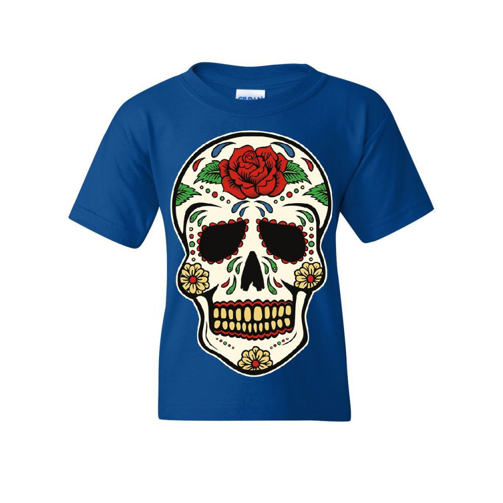 SUGAR SKULL CALAVERA DIA DE LOS MUERTOS sugar skull calavera youth t-shirt dia de los muertos day of the dead kids tee royal blue