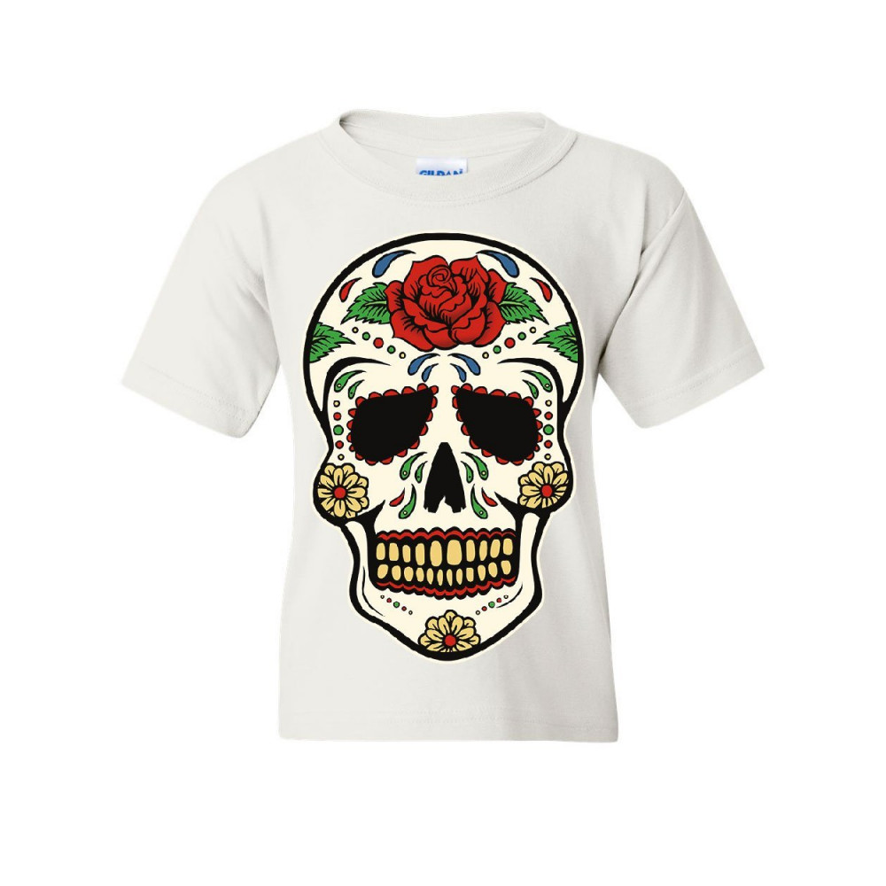 SUGAR SKULL CALAVERA DIA DE LOS MUERTOS sugar skull calavera youth t-shirt dia de los muertos day of the dead kids tee white