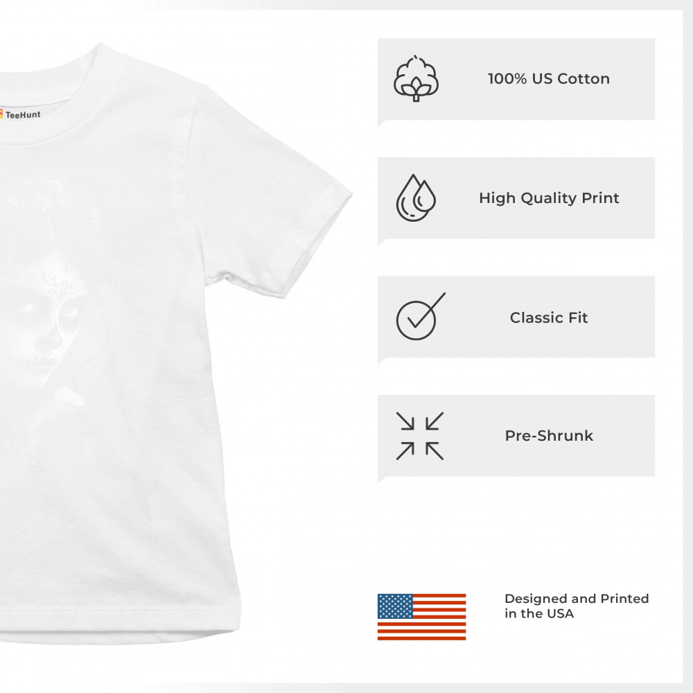 Showcasing a gothic woman with a sugar skull face, this black-and-white design blends DÃa de los Muertos tradition with dark elegance. Intricate face makeup, detailed lace, and a bold monochrome aesthetic create a dramatic visual tribute. A perfect piece for lovers of skull motifs, alt style, and haunting beauty.