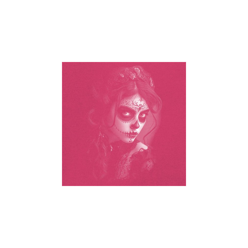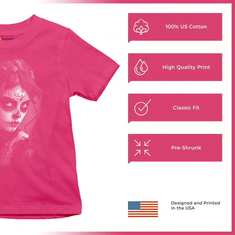 Showcasing a gothic woman with a sugar skull face, this black-and-white design blends DÃa de los Muertos tradition with dark elegance. Intricate face makeup, detailed lace, and a bold monochrome aesthetic create a dramatic visual tribute. A perfect piece for lovers of skull motifs, alt style, and haunting beauty.
