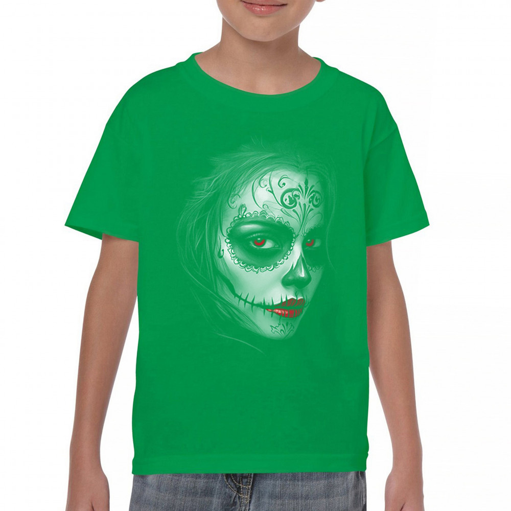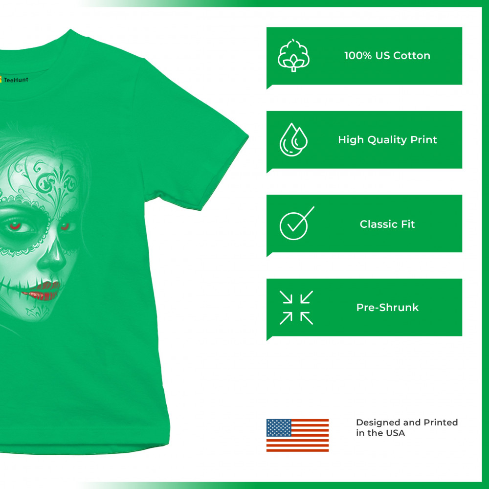Glowing red eyes and red lips bring this sugar skull design to life. Featuring floral skull makeup, dark shadows, and gothic energy, it's a perfect pick for Halloween, DÃa de los Muertos, or alt culture fashion. Ideal for fans of bold beauty, spooky glamour, and skull art with an edge.