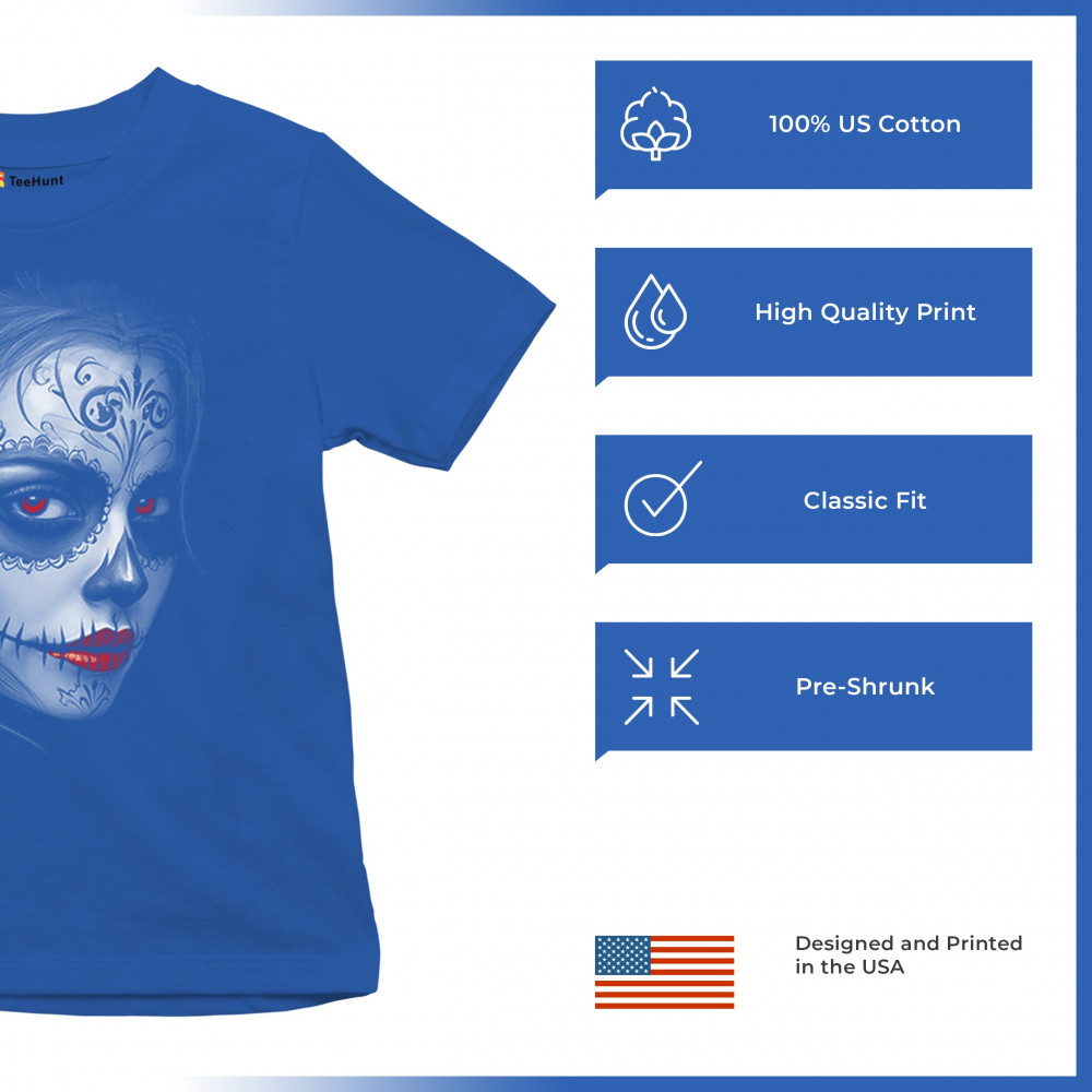 Bold sugar skull design with red eyes, red lips, and gothic makeup. Perfect for Day of the Dead, Halloween, or dark fashion vibes.