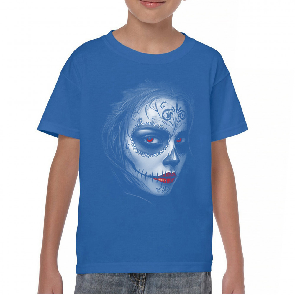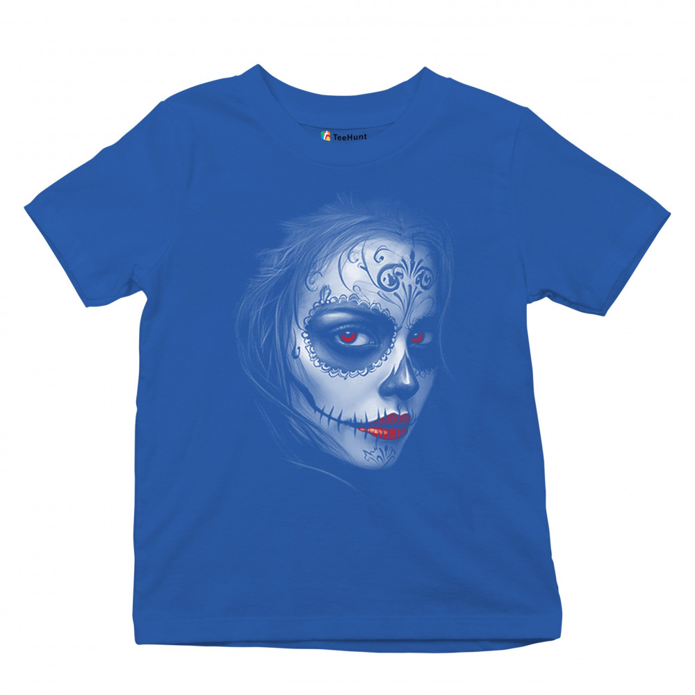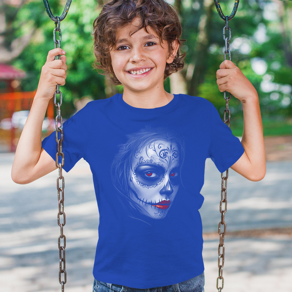 Glowing red eyes and red lips bring this sugar skull design to life. Featuring floral skull makeup, dark shadows, and gothic energy, it's a perfect pick for Halloween, DÃa de los Muertos, or alt culture fashion. Ideal for fans of bold beauty, spooky glamour, and skull art with an edge.