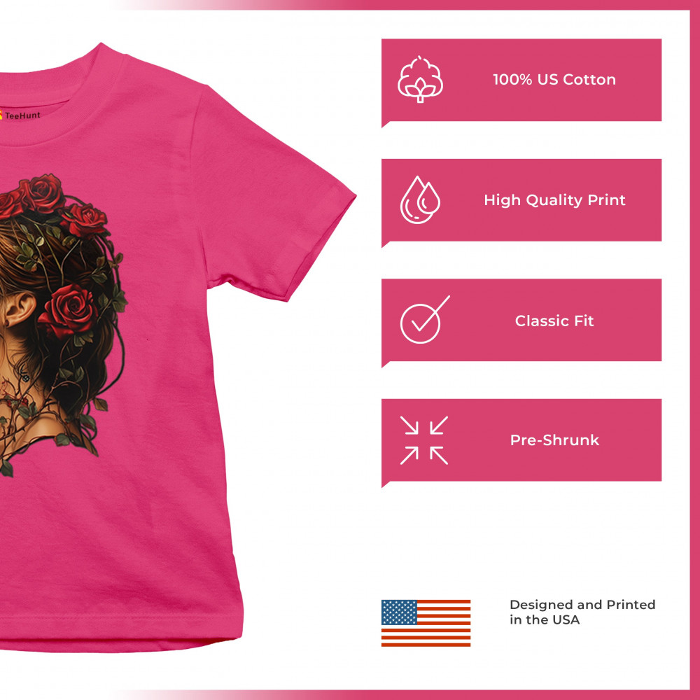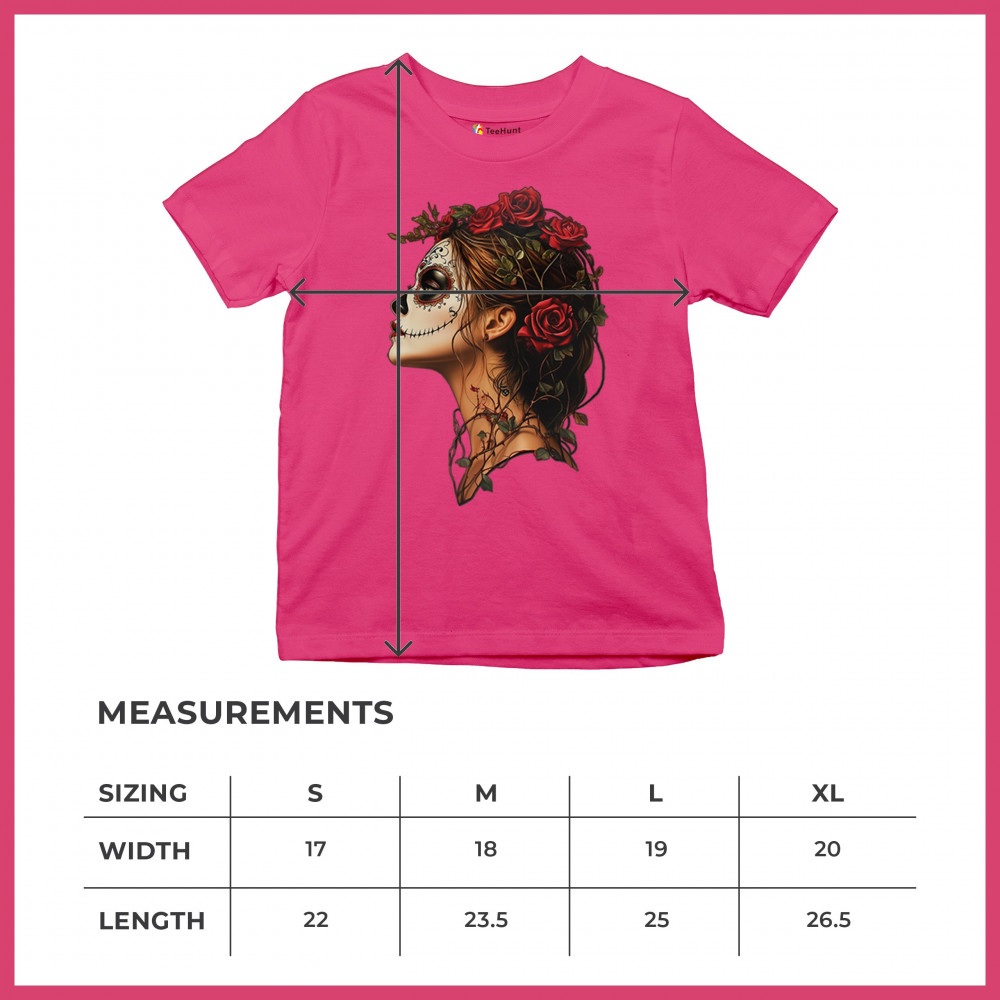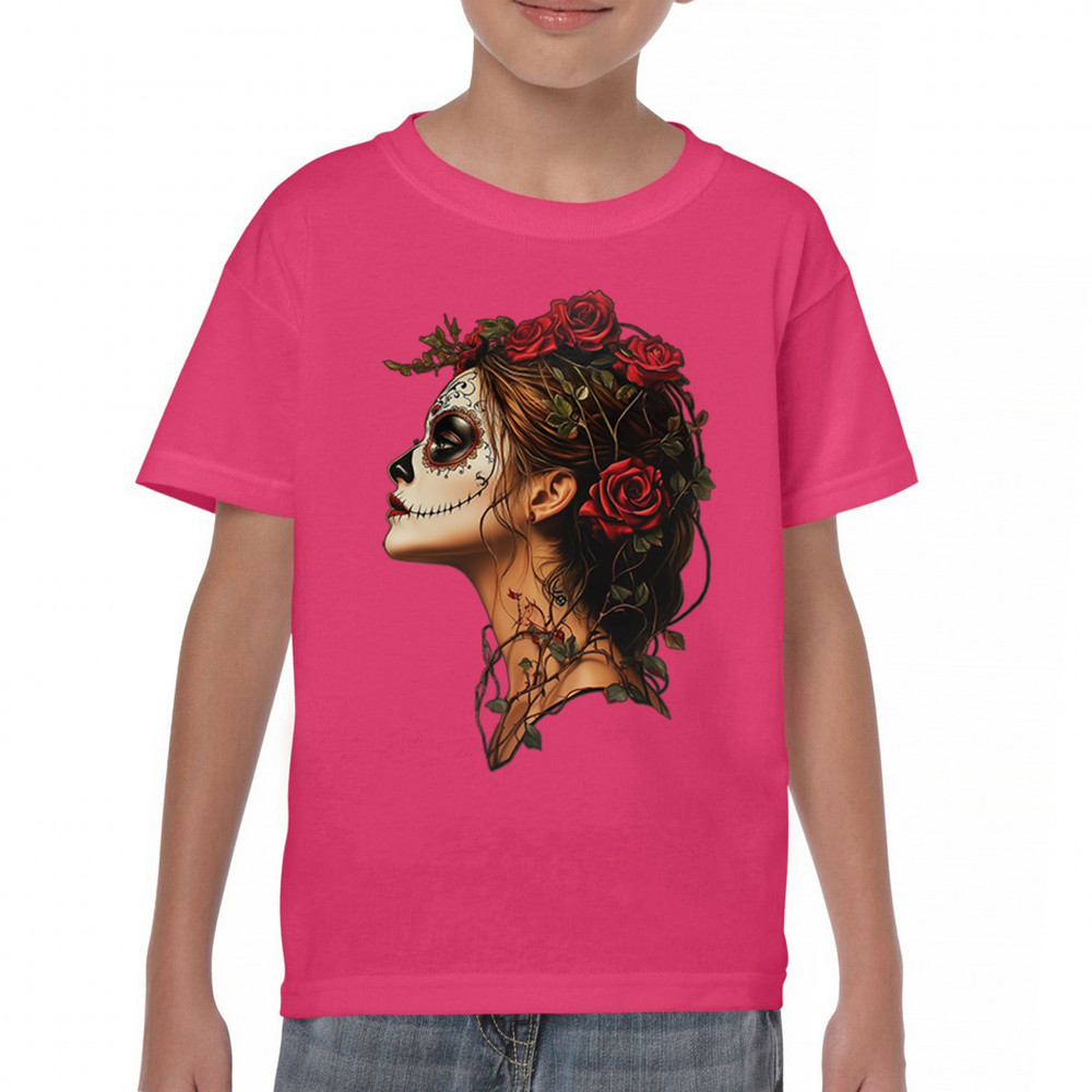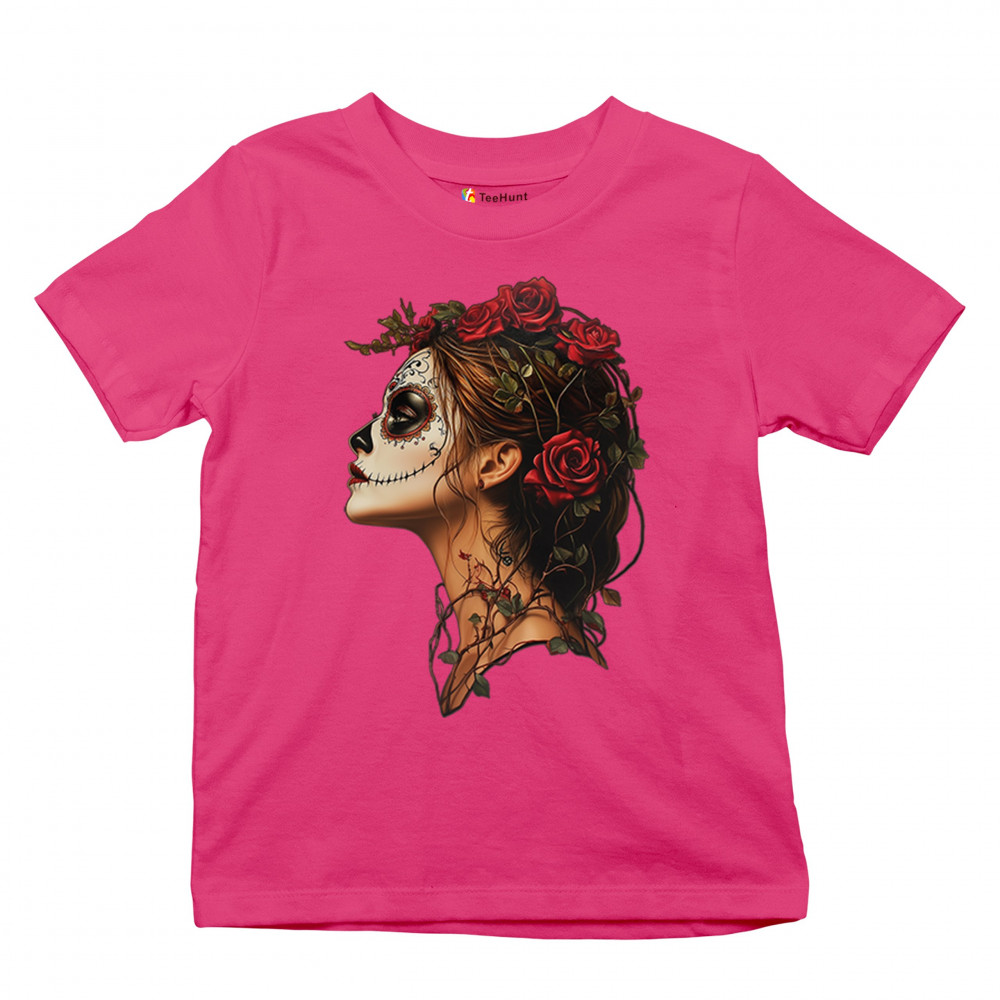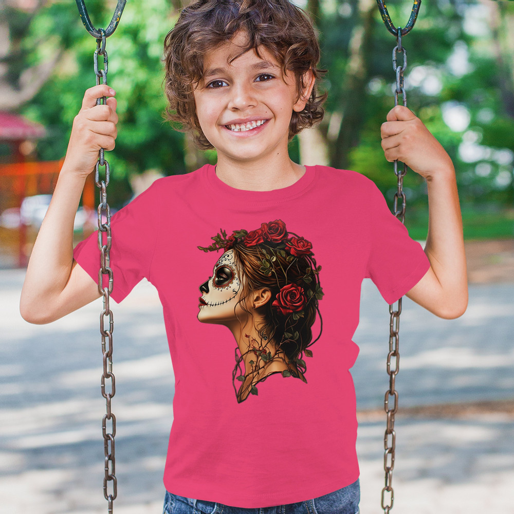 Celebrate feminine power and gothic elegance with this captivating DÃa de los Muertos design. Featuring a woman in profile with sugar skull makeup, blooming red roses, natural vines, dark hair, and symbolic floral skull art, this bold tribute captures beauty, death, and strength in one romantic, detailed visual.