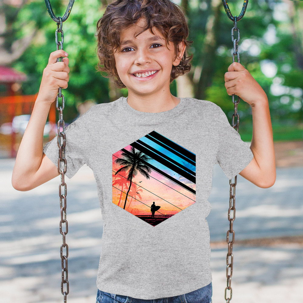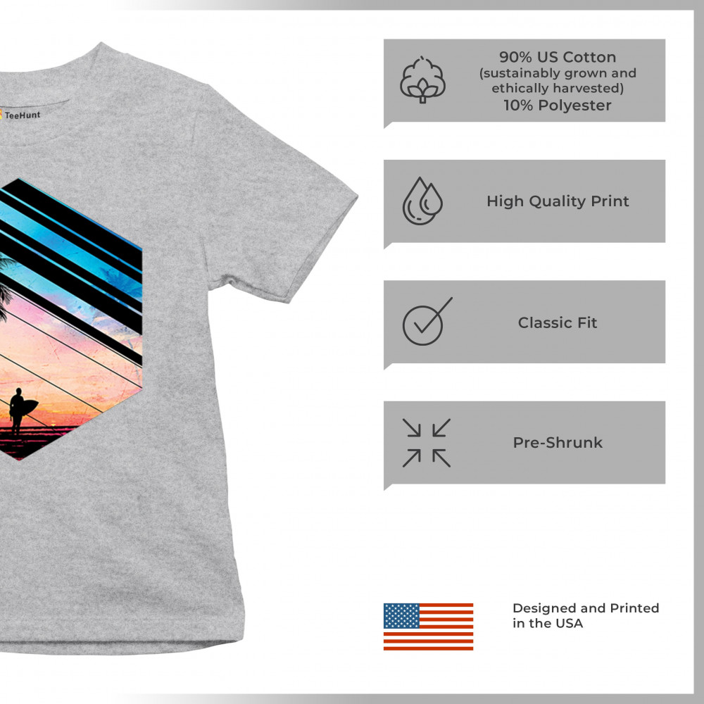 Catch the vibe of endless summer with our surf-inspired tee. Featuring silhouetted palms, warm gradients, and cool geometric shapes, it’s a visual journey from the urban grind to tropical tranquility. This tee is for the soul surfers and dreamers, made to be as enduring as the memories of your last wave. It's more than apparel—it’s a horizon of possibilities. Add this staple to your collection and let the good times roll.