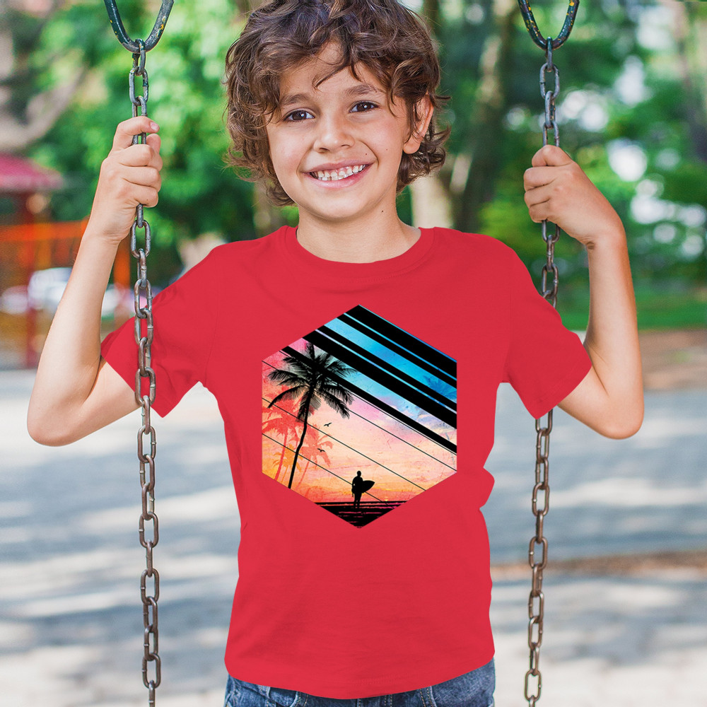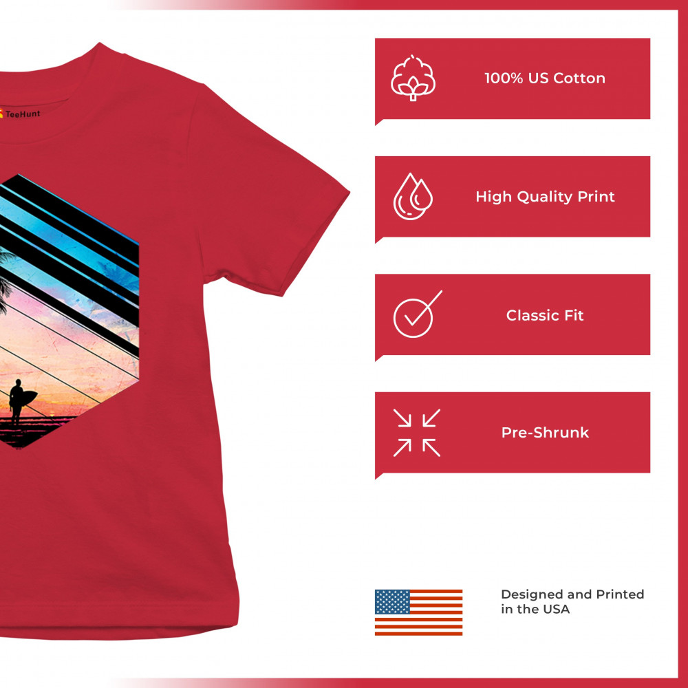 Catch the vibe of endless summer with our surf-inspired tee. Featuring silhouetted palms, warm gradients, and cool geometric shapes, it’s a visual journey from the urban grind to tropical tranquility. This tee is for the soul surfers and dreamers, made to be as enduring as the memories of your last wave. It's more than apparel—it’s a horizon of possibilities. Add this staple to your collection and let the good times roll.