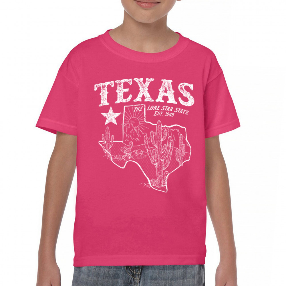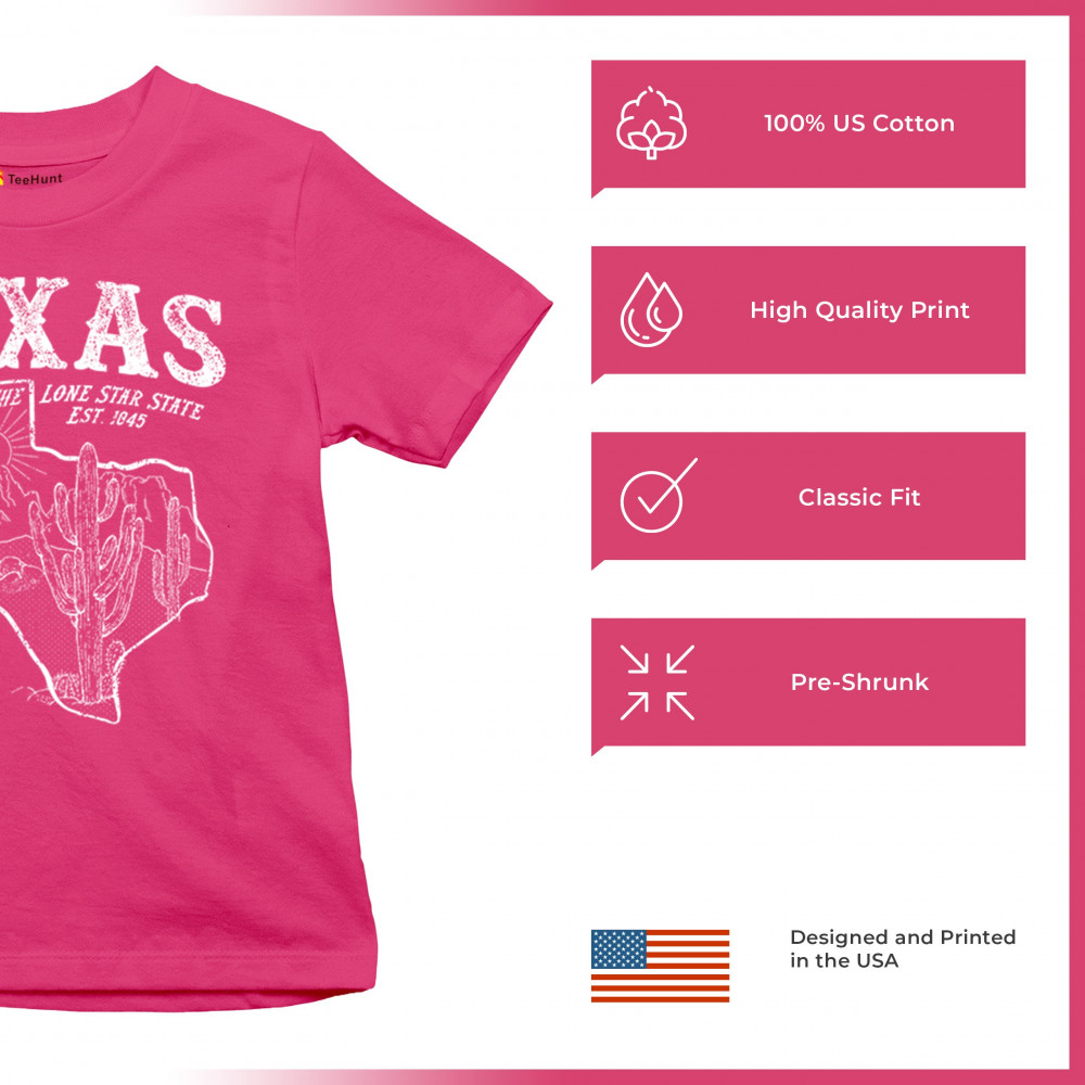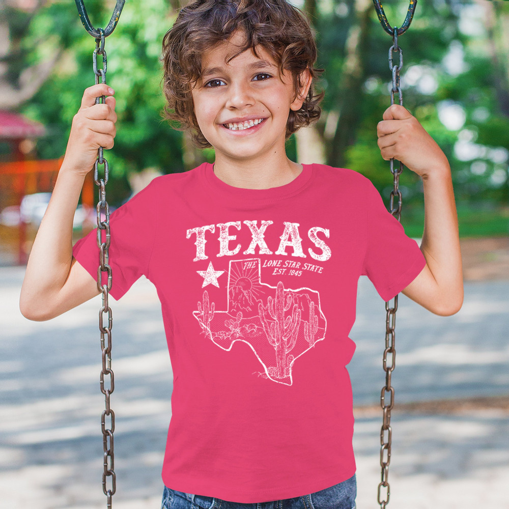 Vintage Texas pride design with cactus, mountains, Lone Star symbol, and 1845 tribute—perfect for rodeos and western events.