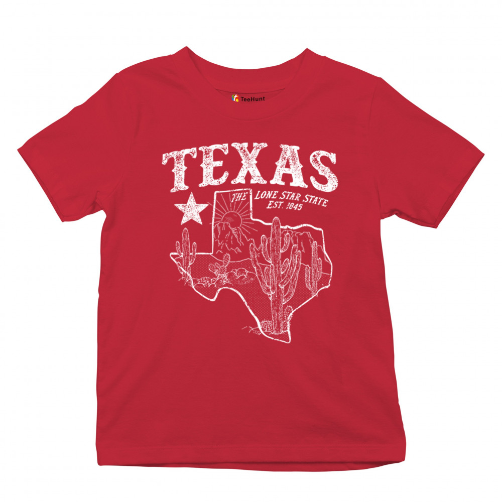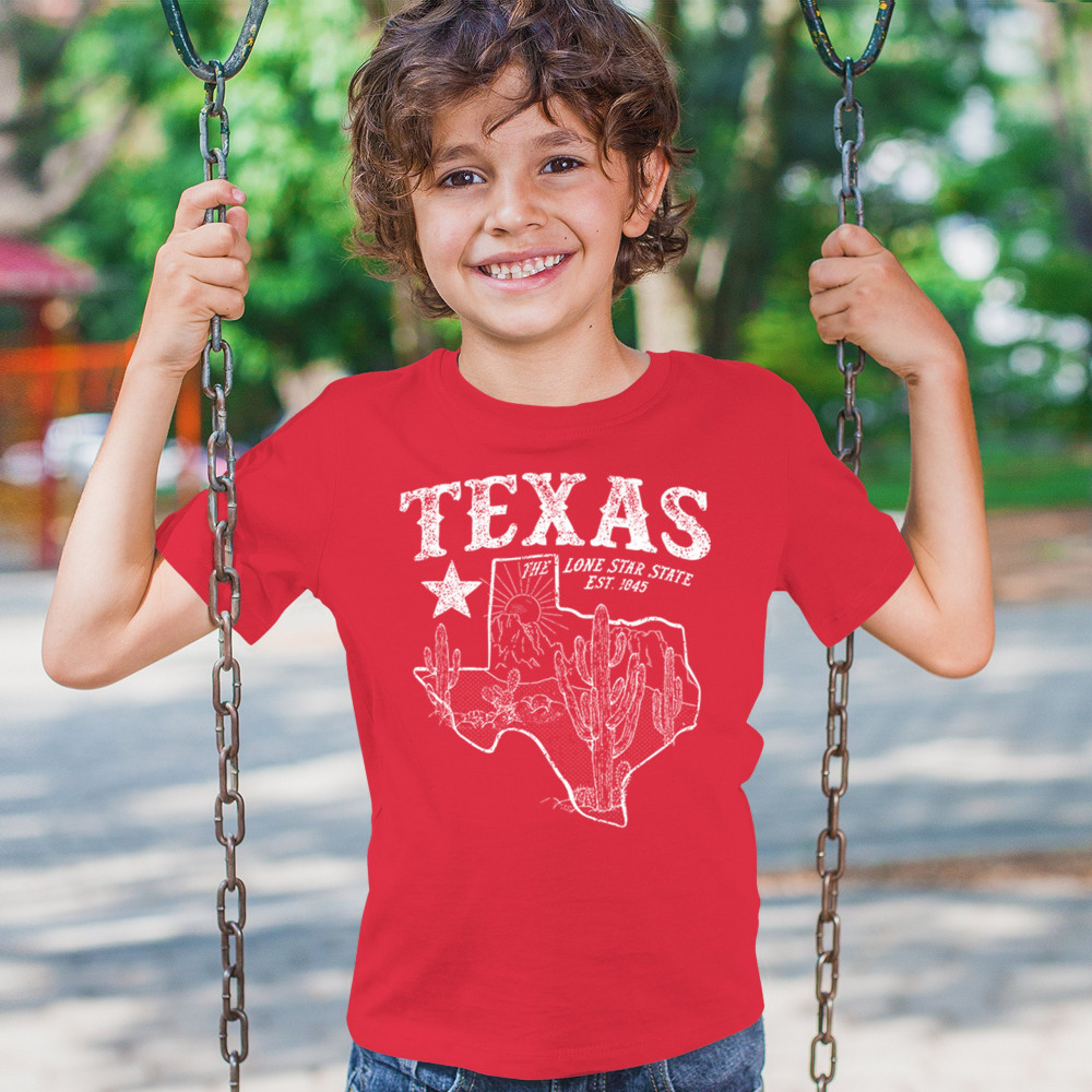 Vintage Texas pride design with cactus, mountains, Lone Star symbol, and 1845 tribute—perfect for rodeos and western events.