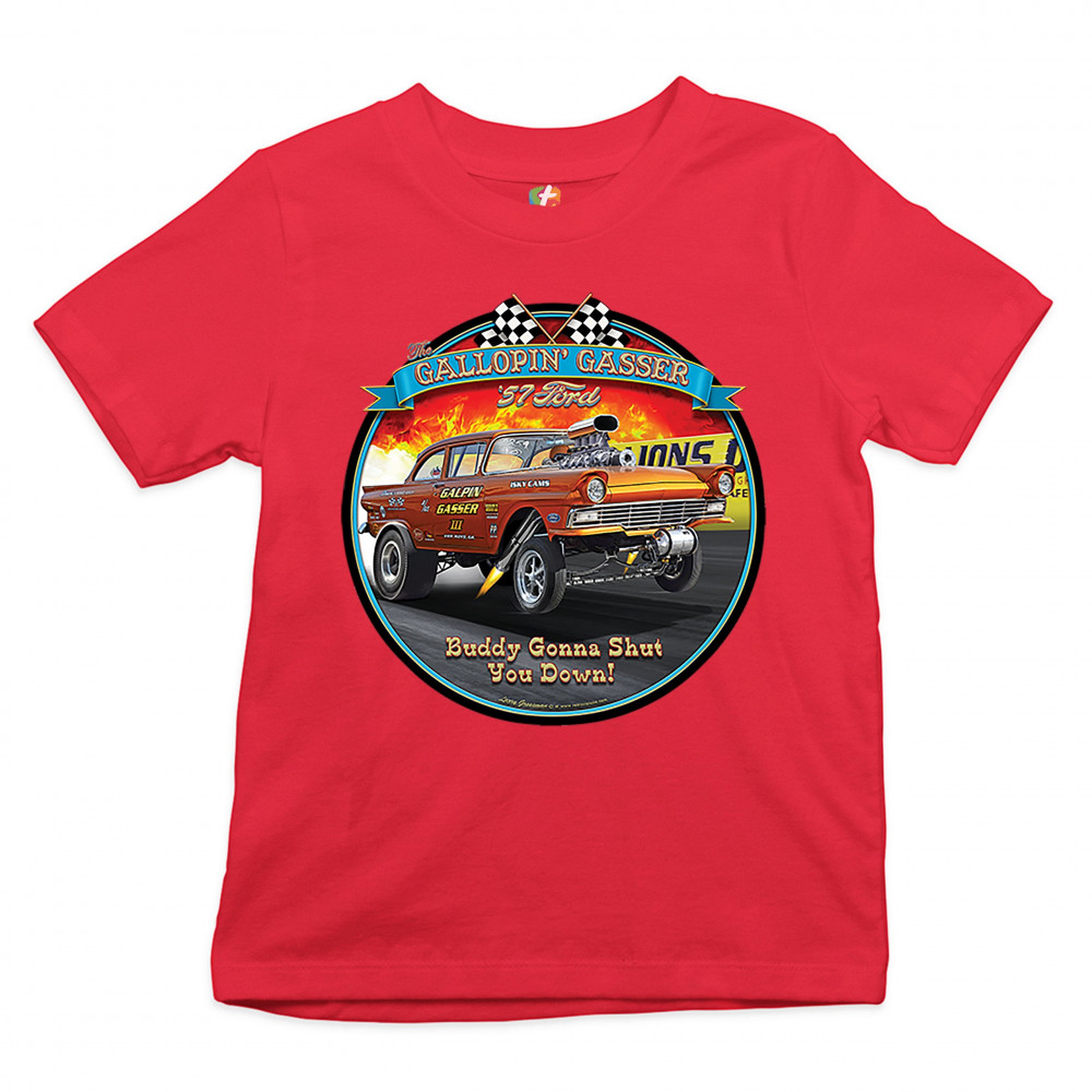 A print featuring a supercharged Ford Gasser sprinting on it's rear wheels in a drag race leaving burning tracks behind it. The print also features a pair of racing flags and says: "The Gallopin' Gasser '57 Ford" and "Buddy Gonna Shut You Down!". A great
