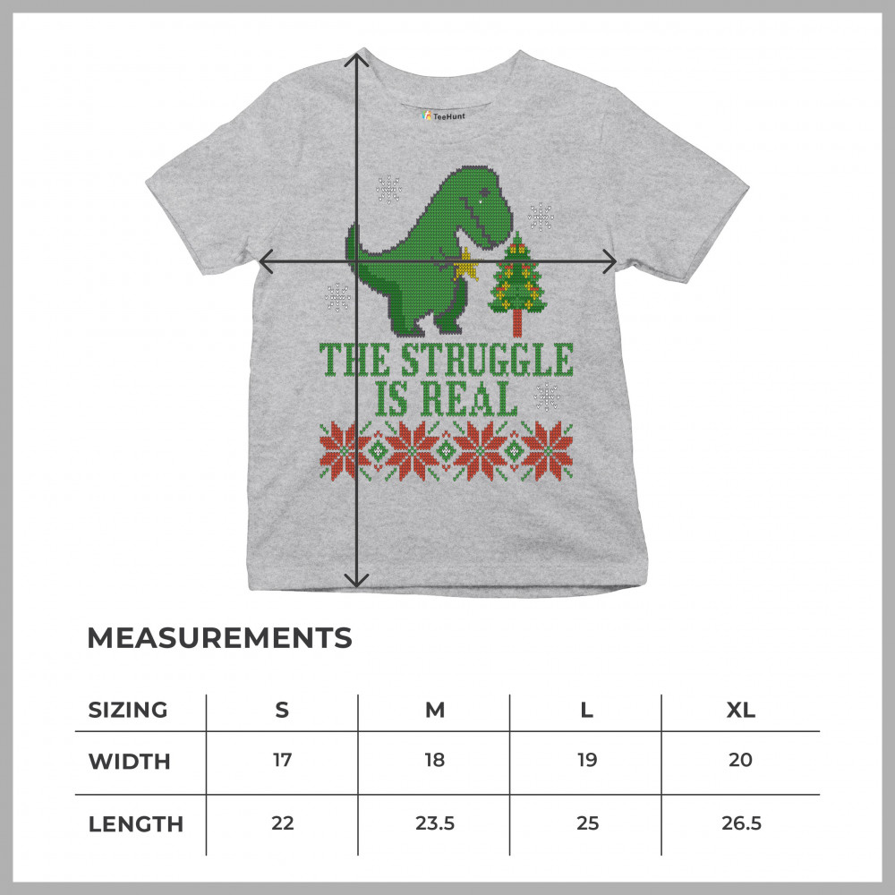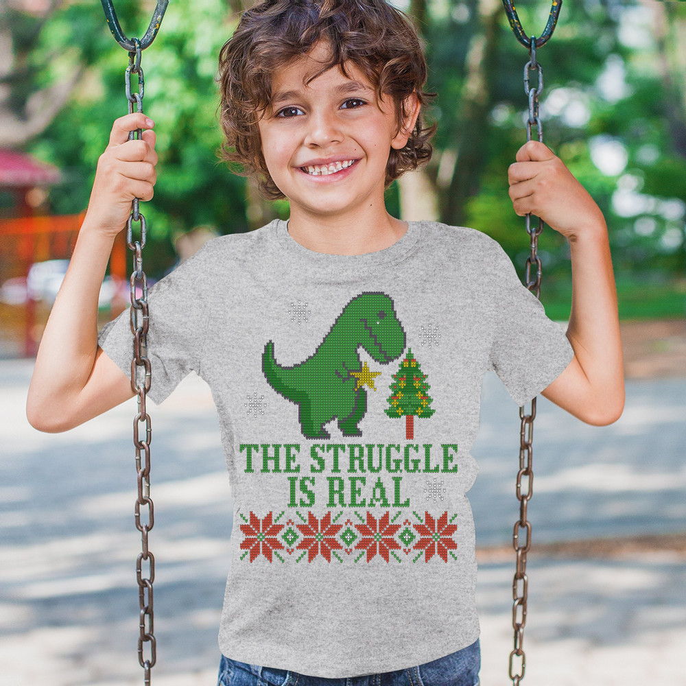 A funny print saying: "The Struggle Is Real" and featuring a sad tyrannosaurus rex holding a toy star in it's short hands standing by a Christmas tree. The print is decorated as an ugly sweater. Amazing choice to make people smile and spread positive vibe