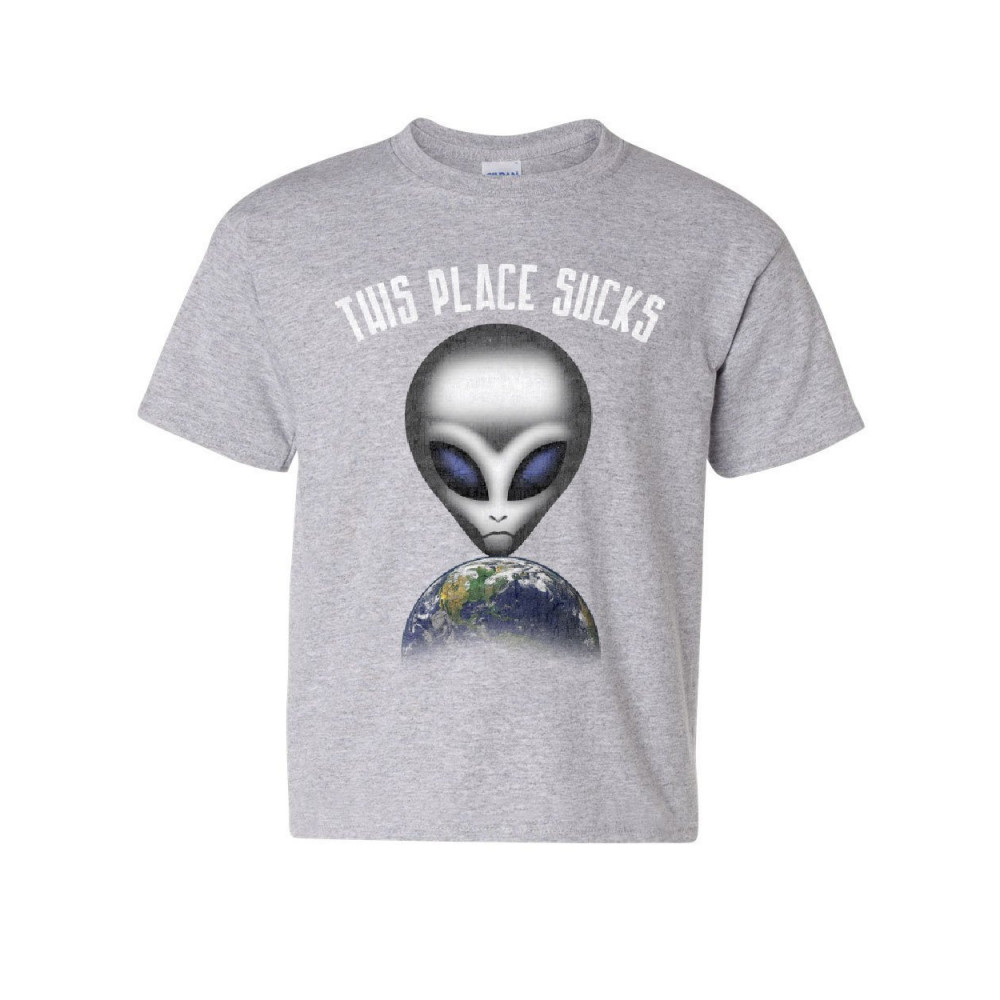 THIS PLACE SUCKS youth t-shirt funny ufo alien space universe earth kids tee gray