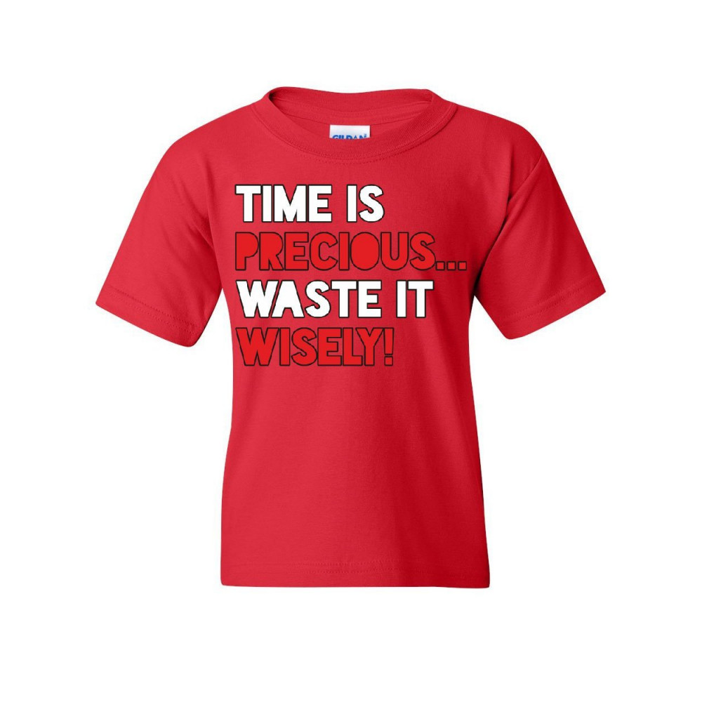 TIME IS PRECIOUS WASTE IT WISELY! time is precious waste it wisely youth t-shirt college humor lazy fun kids tee red