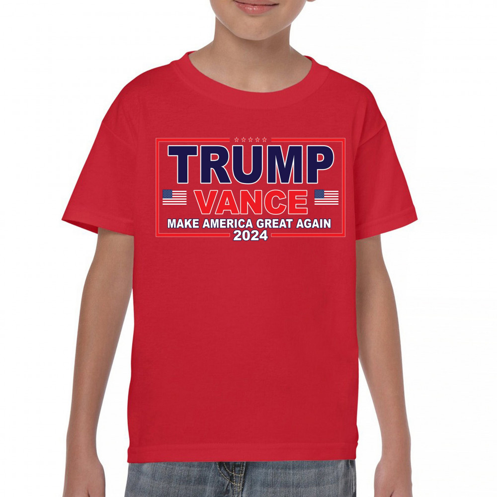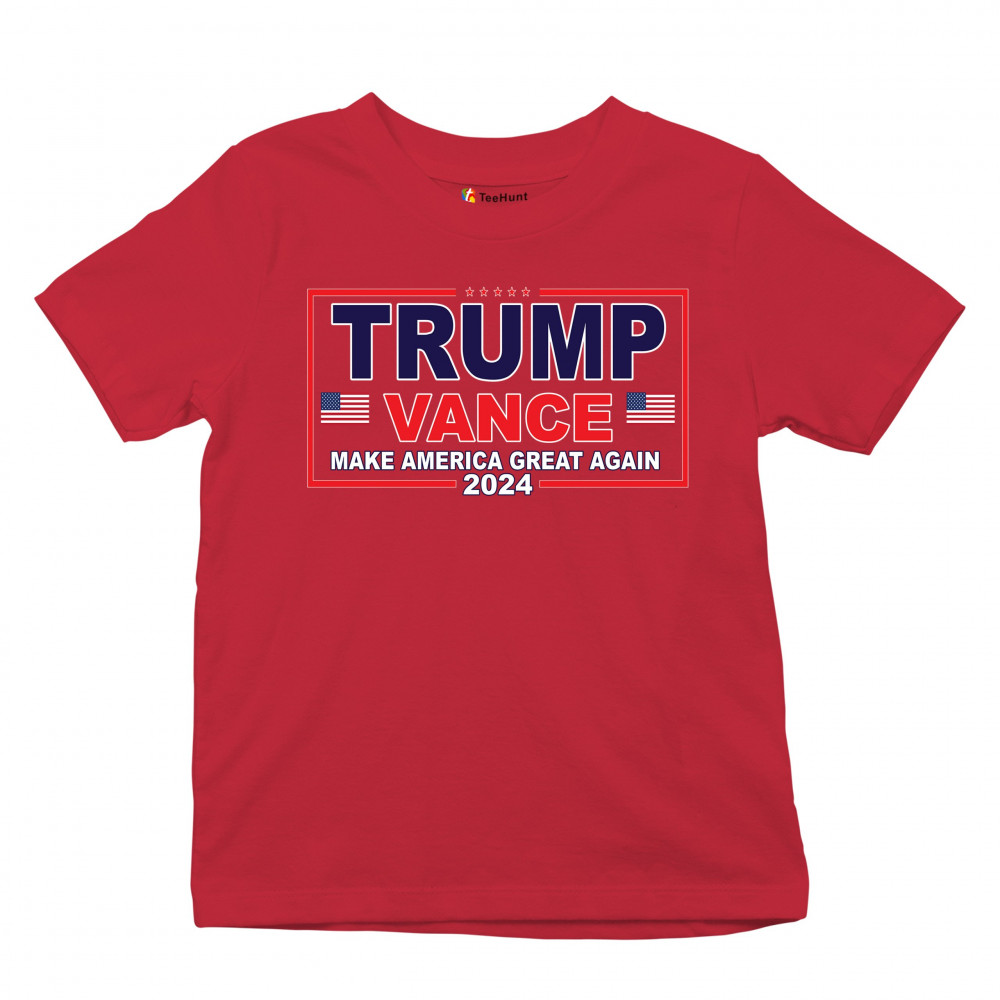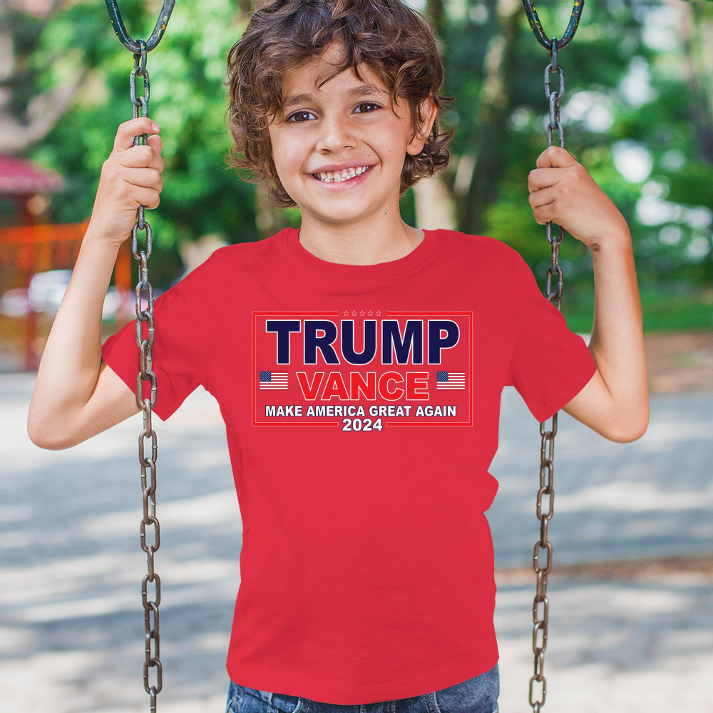 Showcase your support for the Trump-Vance 2024 campaign with this bold patriotic design featuring the American flag and "Make America Great Again" slogan.