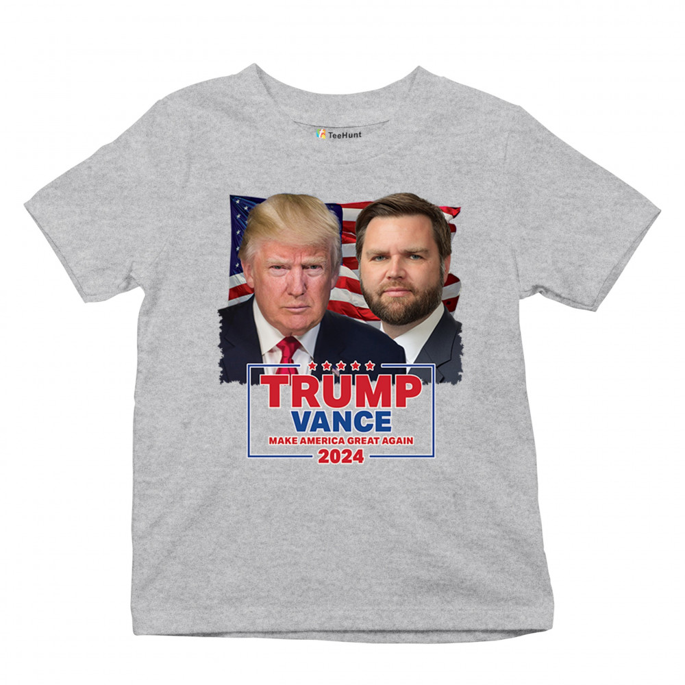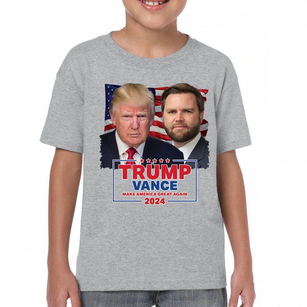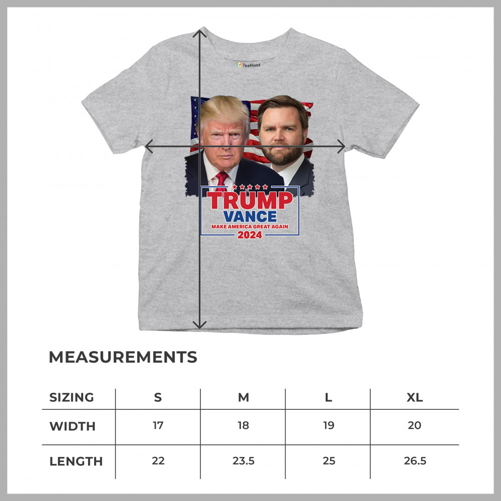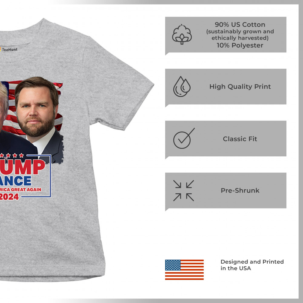 Show your support for Trump-Vance 2024 with this bold design featuring Trump and Vance against the American flag. Perfect for rallies and political events.