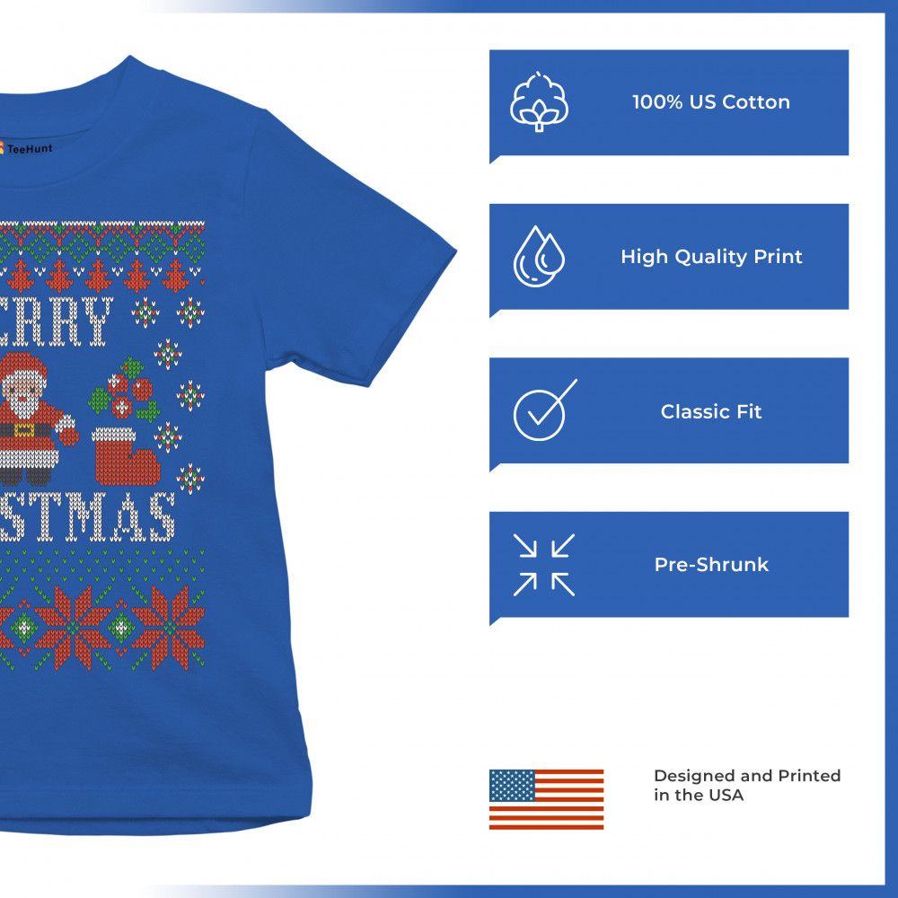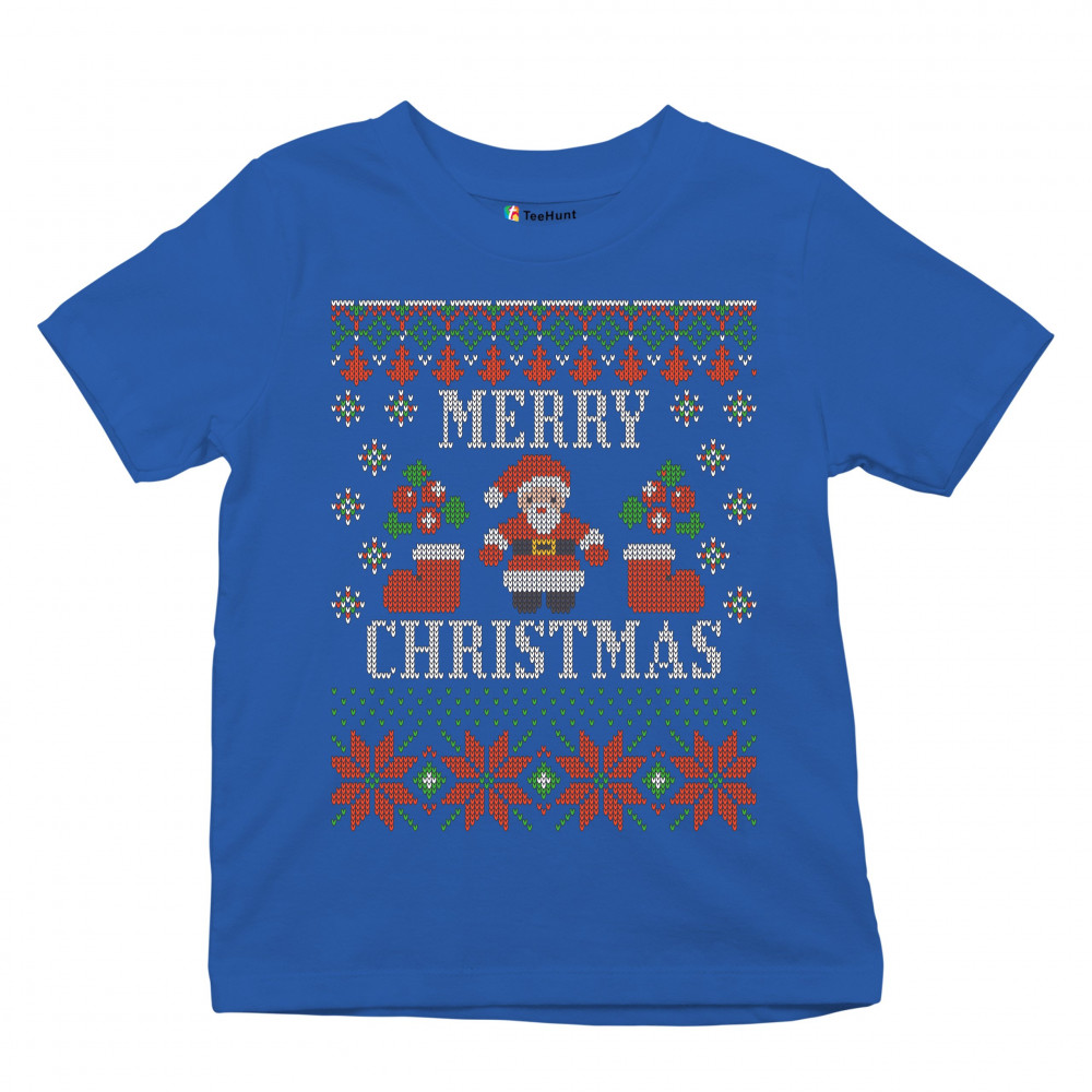 UGLY SWEATER SANTA CLAUS youth t-shirt let it snow christmas jingle bells kids royal blue