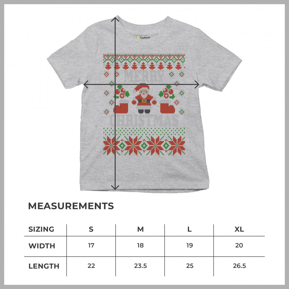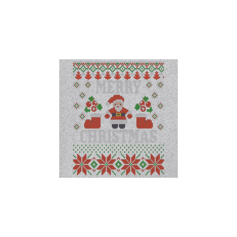 A print saying: "Merry Christmas" and depicting Santa Claus, two Christmas socks, multiple snowflakes and Christmas trees. The print is decorated as an ugly sweater. A great choice for a Christmas eve celebration.